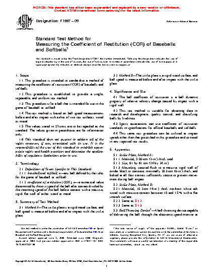 1.1 This procedure is intended to standardize a method of measuring the coefficient of restitution (COR) of baseballs and softballs.