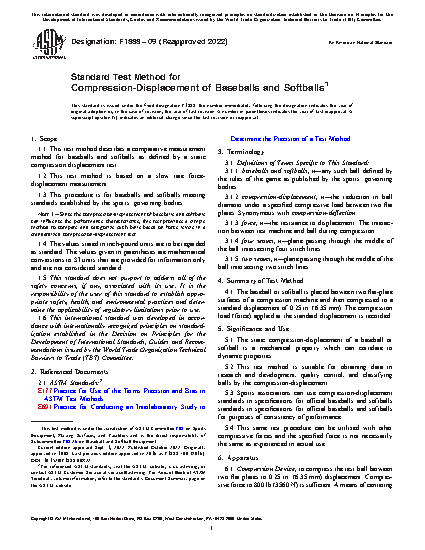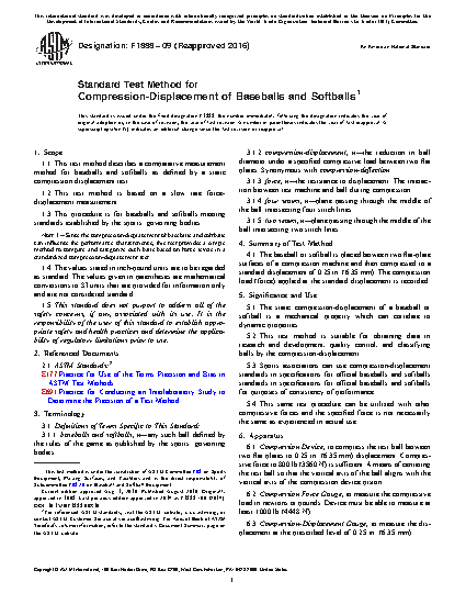 1.1 This test method describes a comparative measurement method for baseballs and softballs as defined by a static compression displacement test.