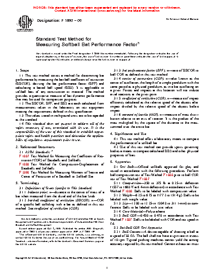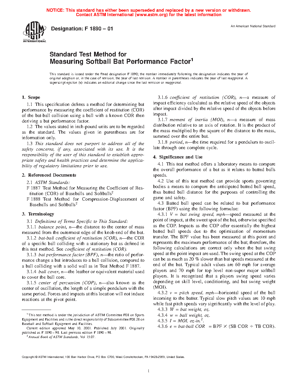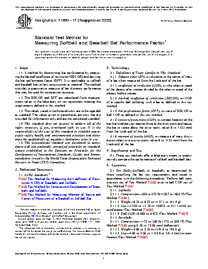 1.1 This specification defines a method for determining bat performance by measuring the coefficient of restitution (COR) of the bat-ball collision using a ball with a known COR then deriving a bat performance factor.