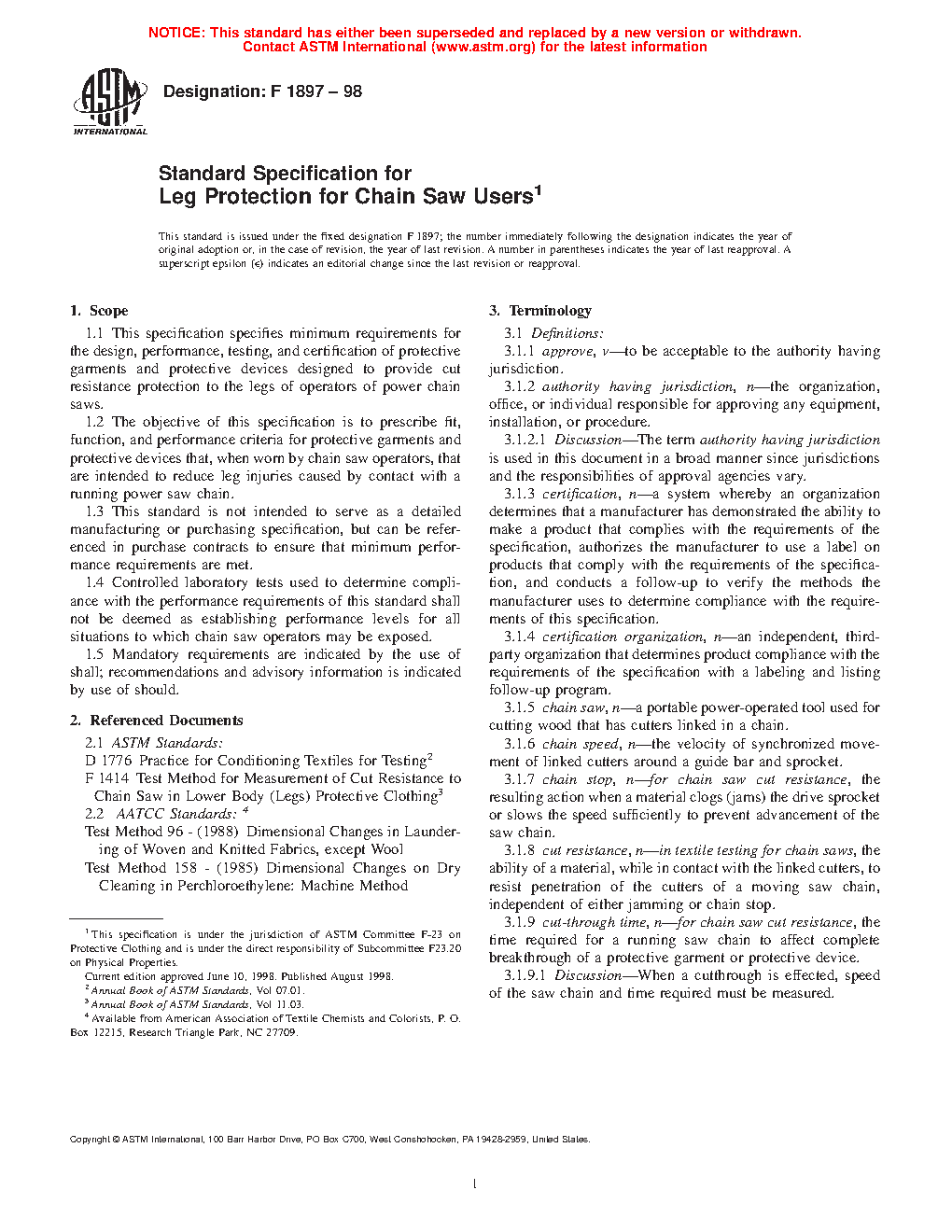 1.1 This specification specifies minimum requirements for the design, performance, testing, and certification of protective clothing and protective devices designed to provide cut resistance protection to the legs of operators of power chain saws.