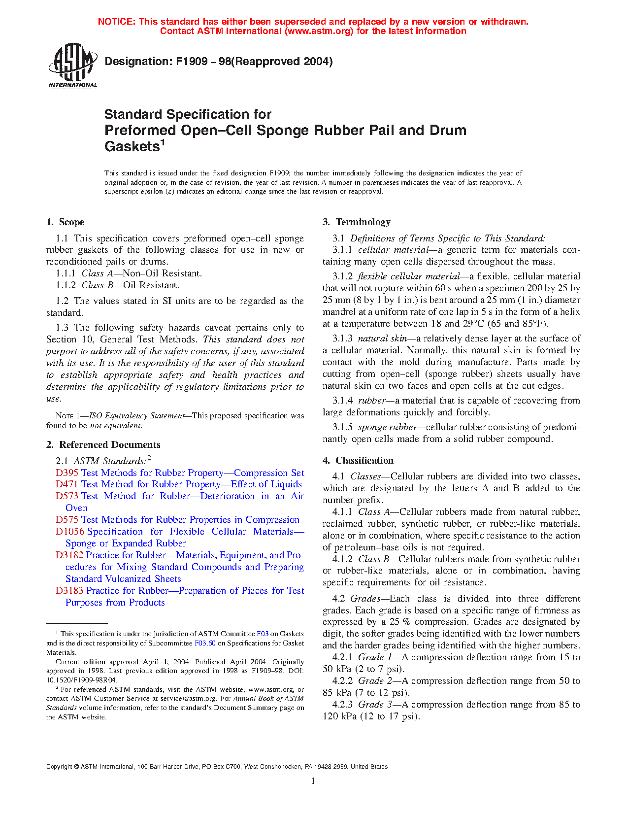 1.1 This specification covers preformed open–cell sponge rubber gaskets of the following classes for use in new or reconditioned pails or drums.