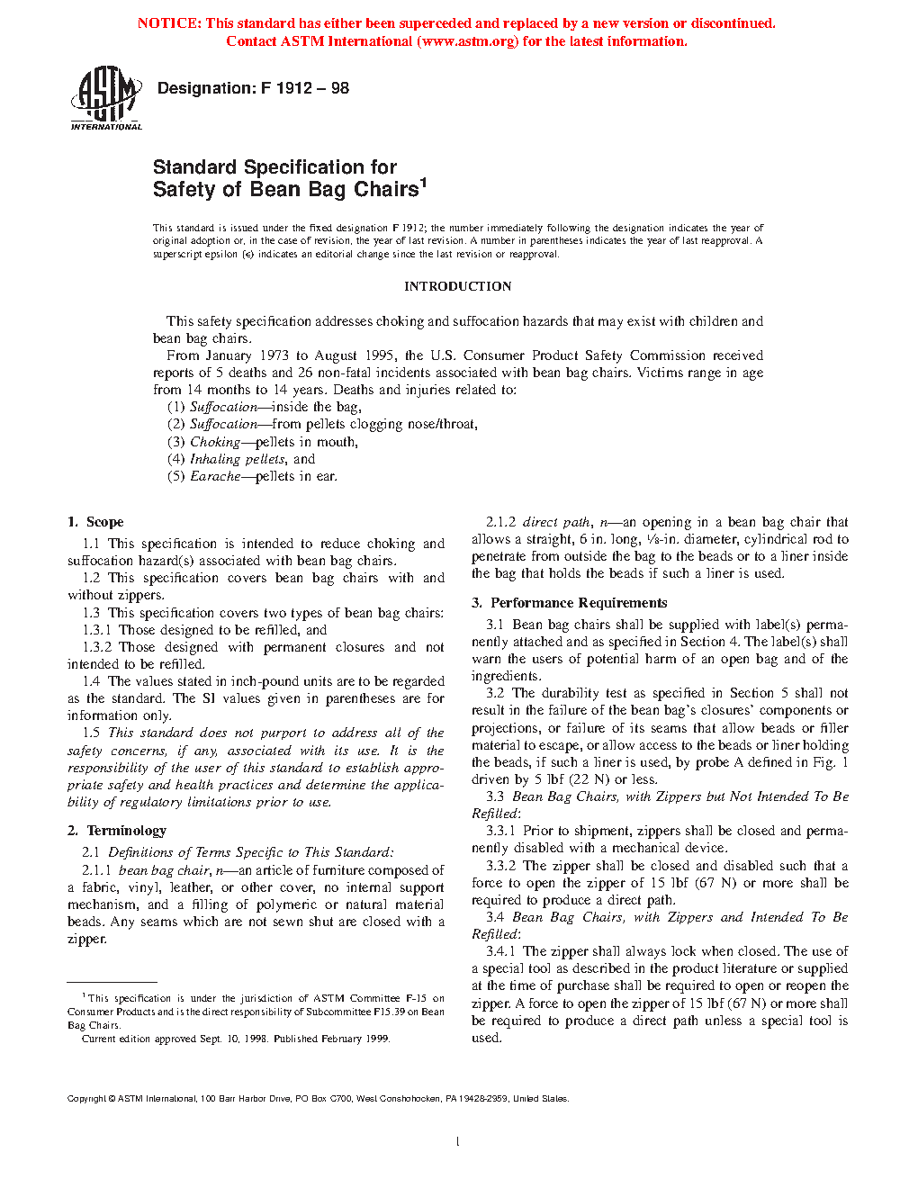 1.1 This specification is intended to reduce choking and suffocation hazard(s) associated with bean bag chairs and bean bag covers.