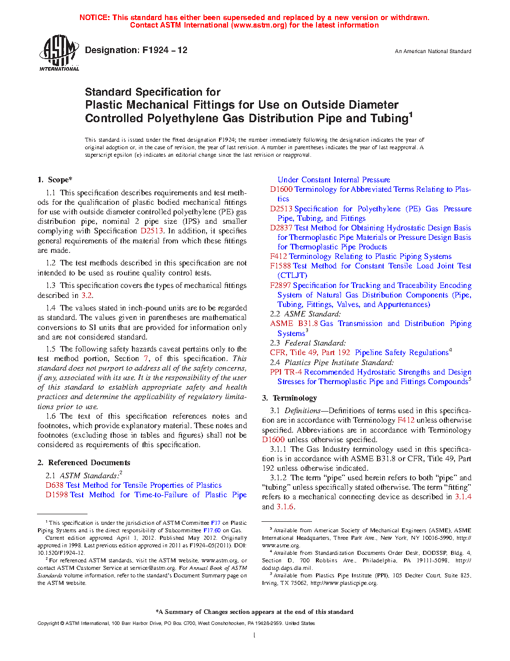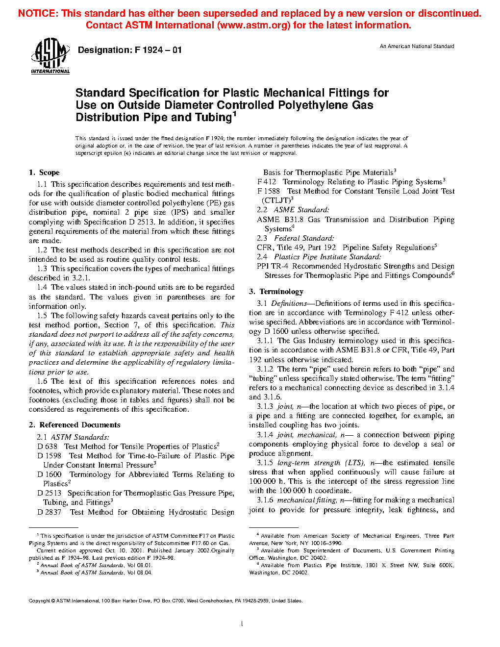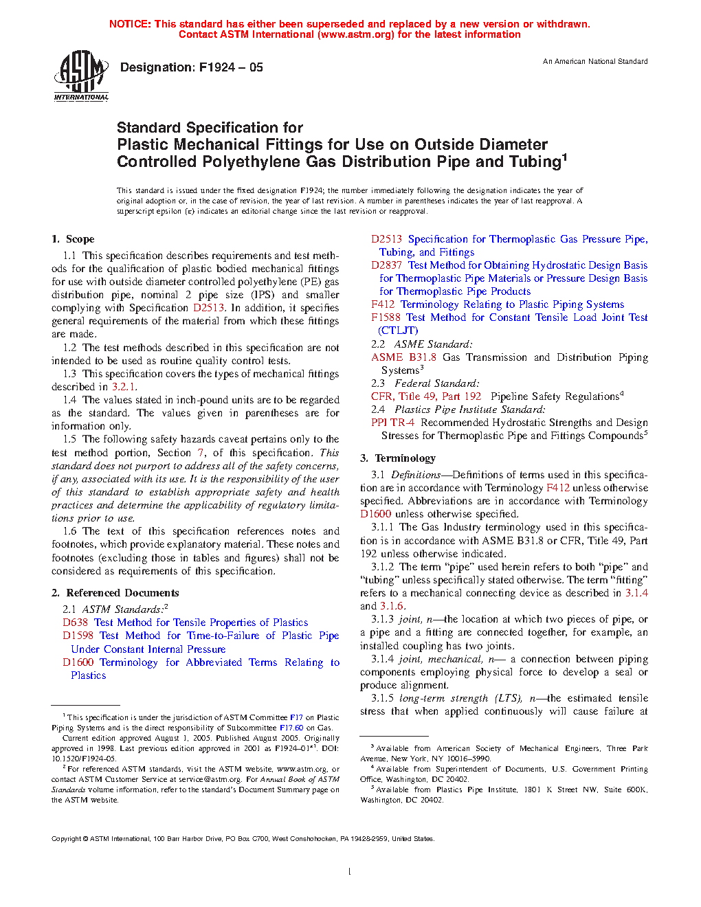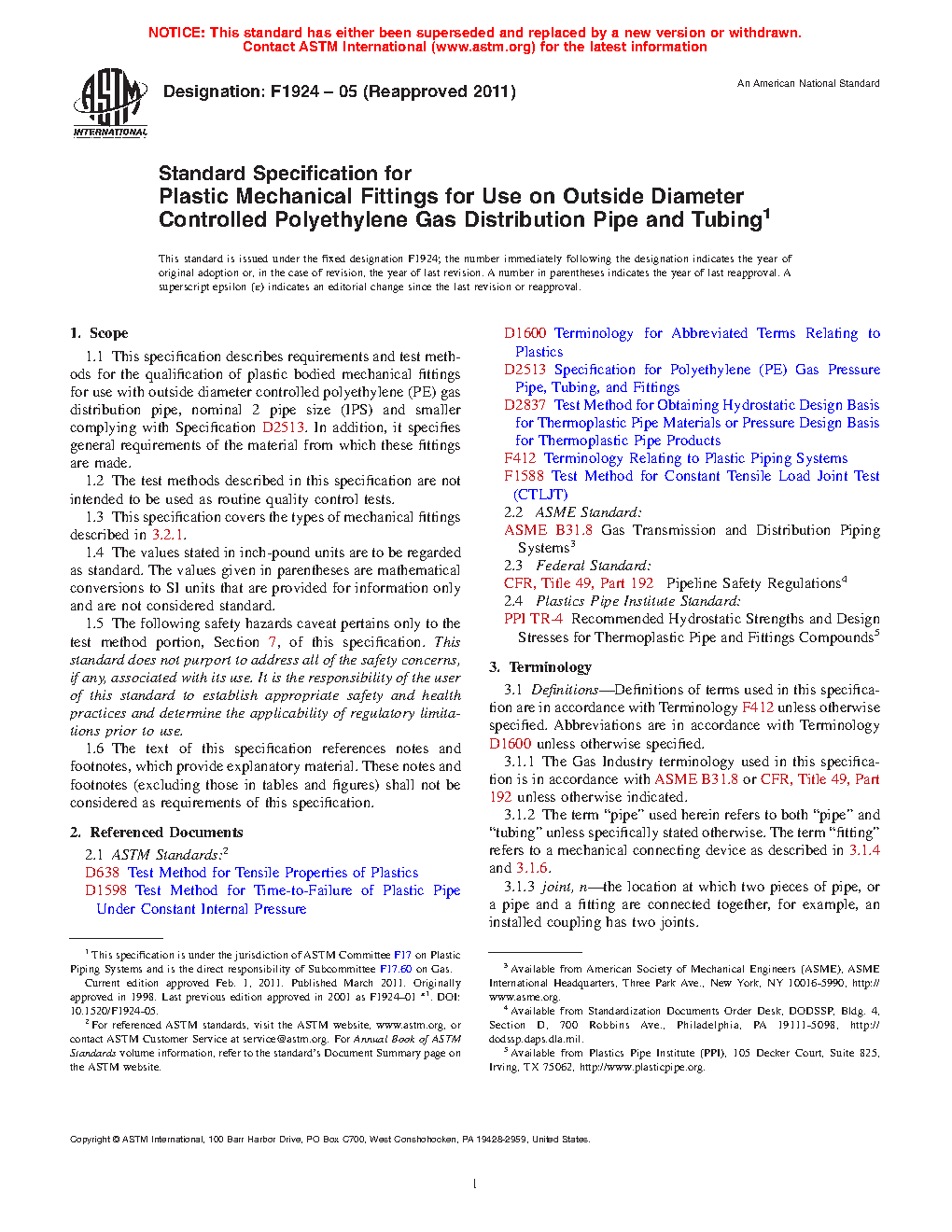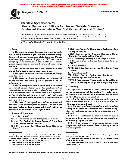 1.1 This specification describes requirements and test methods for the qualification of plastic bodied mechanical fittings for use with outside diameter controlled polyethylene (PE) gas distribution pipe, nominal 2 pipe size (IPS) and smaller complying with Specification D2513. In addition, it specifies general requirements of the material from which these fittings are made.