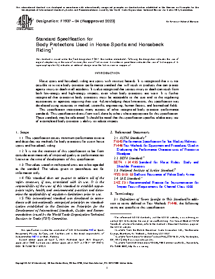1.1 This specification covers minimum performance criteria and describes test methods for body protectors for use in horse sports and horseback riding.