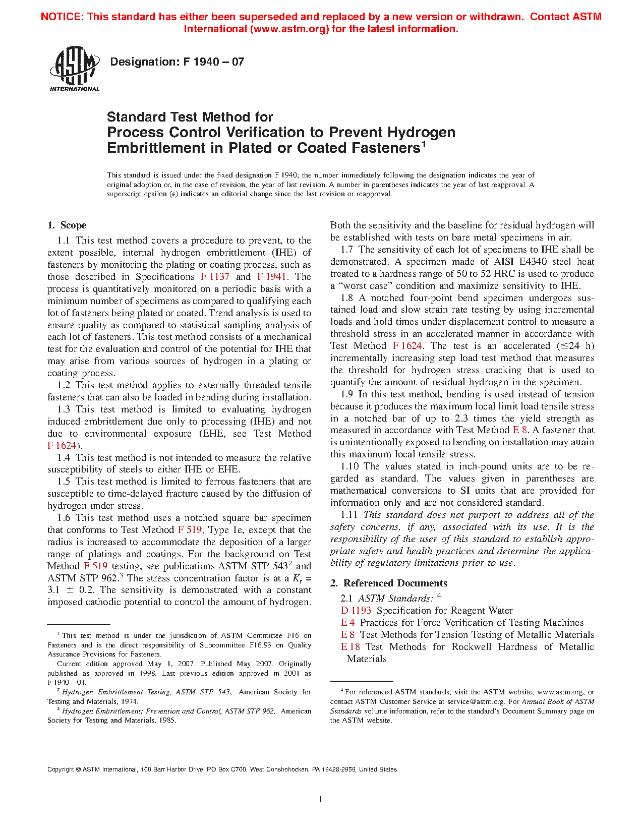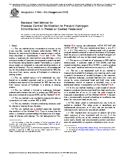 1.1 This test method covers a procedure to prevent, to the extent possible, internal hydrogen embrittlement (IHE) of fasteners by monitoring the plating or coating process, such as those described in Specifications F1137 and F1941. The process is quantitatively monitored on a periodic basis with a minimum number of specimens as compared to qualifying each lot of fasteners being plated or coated. Trend analysis is used to ensure quality as compared to statistical sampling analysis of each lot of fasteners. This test method consists of a mechanical test for the evaluation and control of the potential for IHE that may arise from various sources of hydrogen in a plating or coating process.
