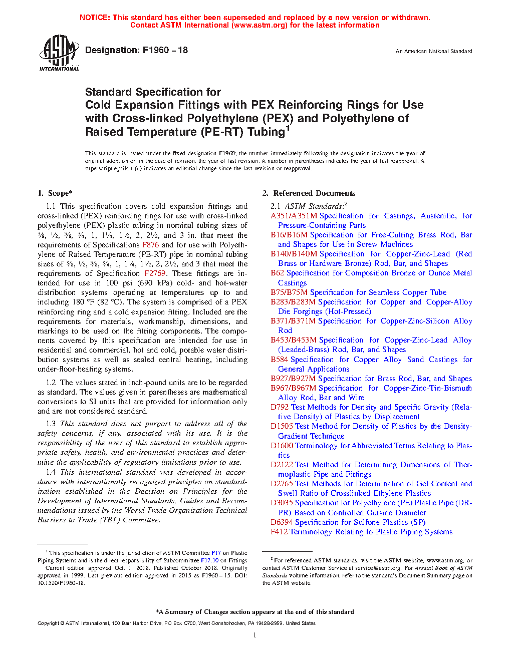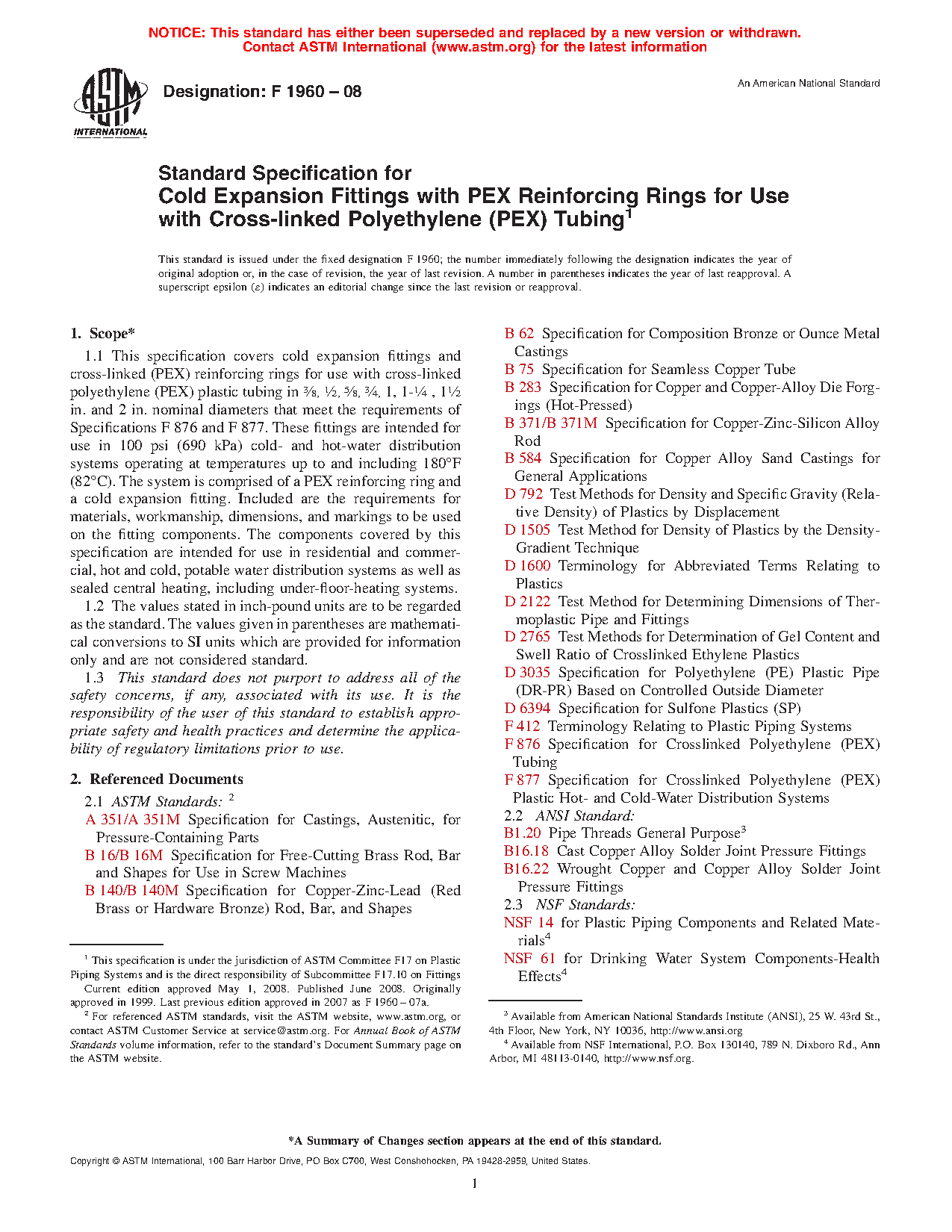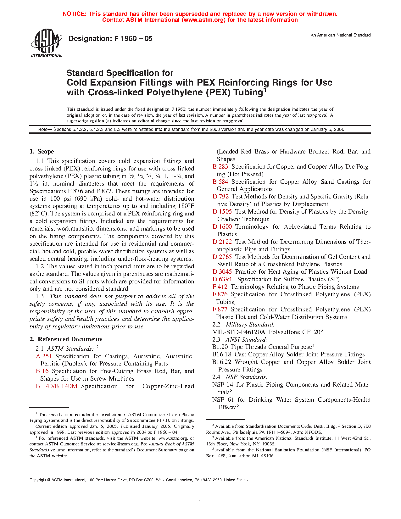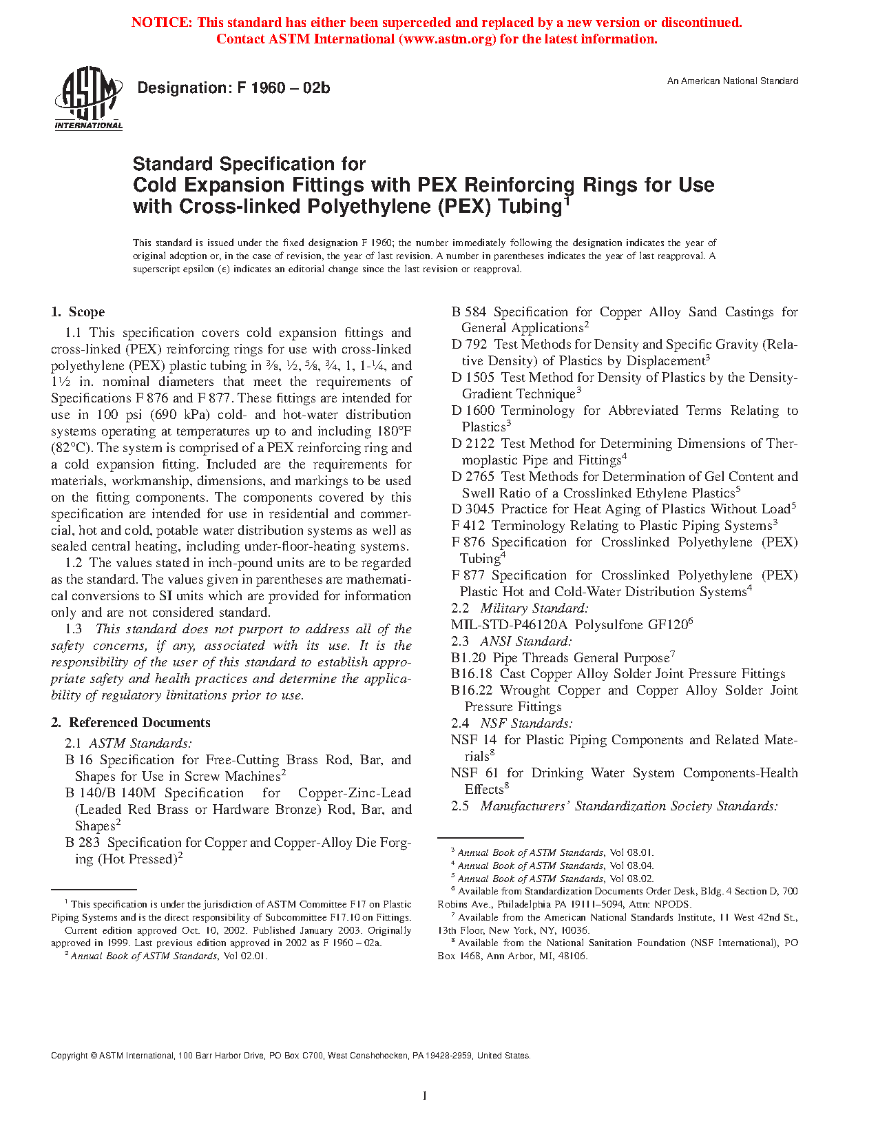 1.1 This specification covers cold expansion fittings and cross-linked (PEX) reinforcing rings for use with cross-linked polyethylene (PEX) plastic tubing in 3/8, 1/2, 5/8, 3/4, and 1-in. nominal diameters. These fittings are intended for use in 100 psi (690 kPa) cold- and hot-water distribution systems operating at temperatures up to and including 180oF (82oC). The system is comprised of a PEX reinforcing ring and a cold expansion fitting. Included are the requirements for materials, workmanship, dimensions, burst pressure, sustained pressure, excessive temperature and pressure, termperature cycling tests, and markings to be used on the fitting components. The components covered by this specification are intended for use in residential and commercial, hot and cold, potable water distribution systems as well as sealed central heating, including under-floor-heating systems.