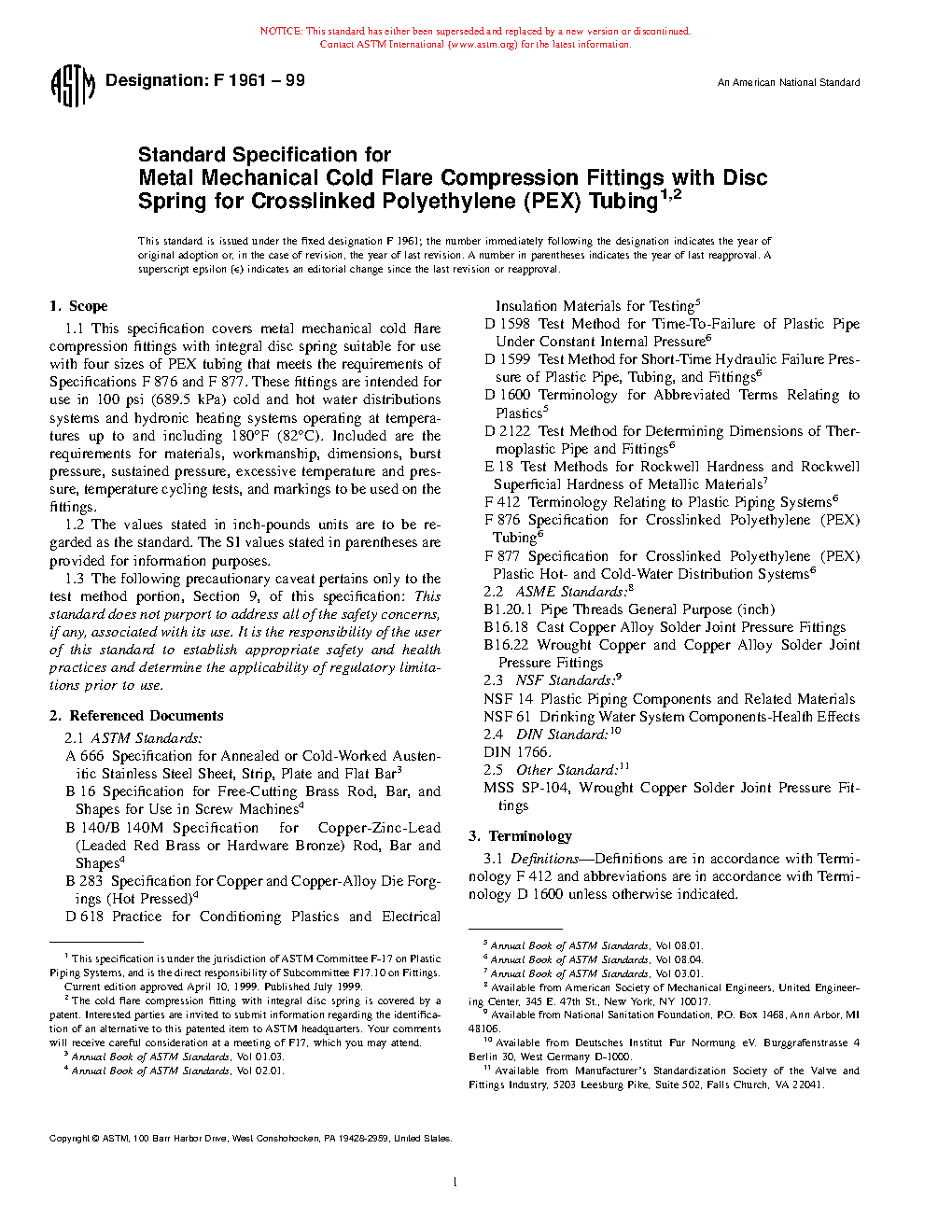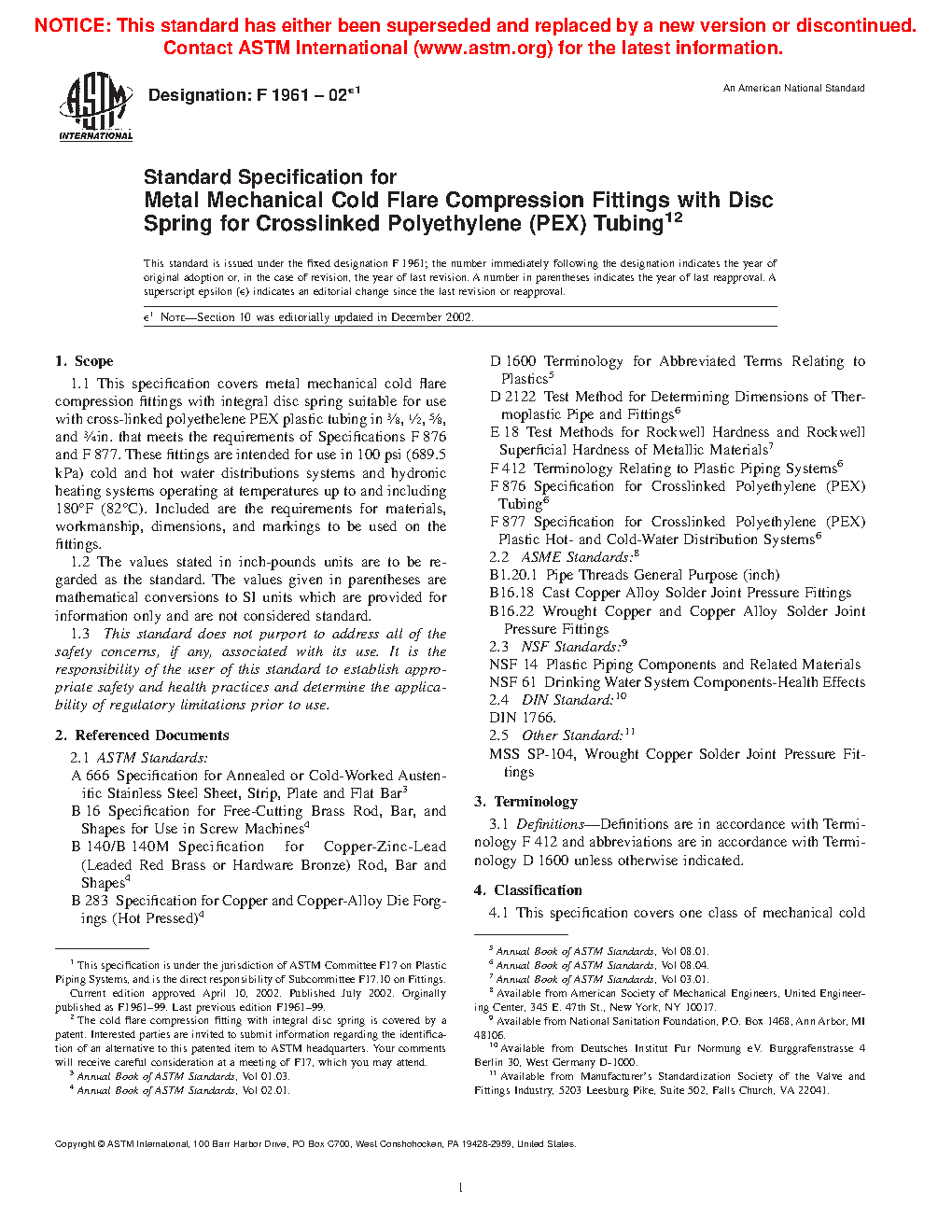 1.1 This specification covers metal mechanical cold flare compression fittings with integral disc spring suitable for use with four sizes of PEX tubing that meets the requirements of Specifications F876 and F877. These fittings are intended for use in 100 psi (689.5 kPa) cold and hot water distributions systems and hydronic heating systems operating at temperatures up to and including 180°F (82°C). Included are the requirements for materials, workmanship, dimensions, burst pressure, sustained pressure, excessive temperature and pressure, temperature cycling tests, and markings to be used on the fittings.