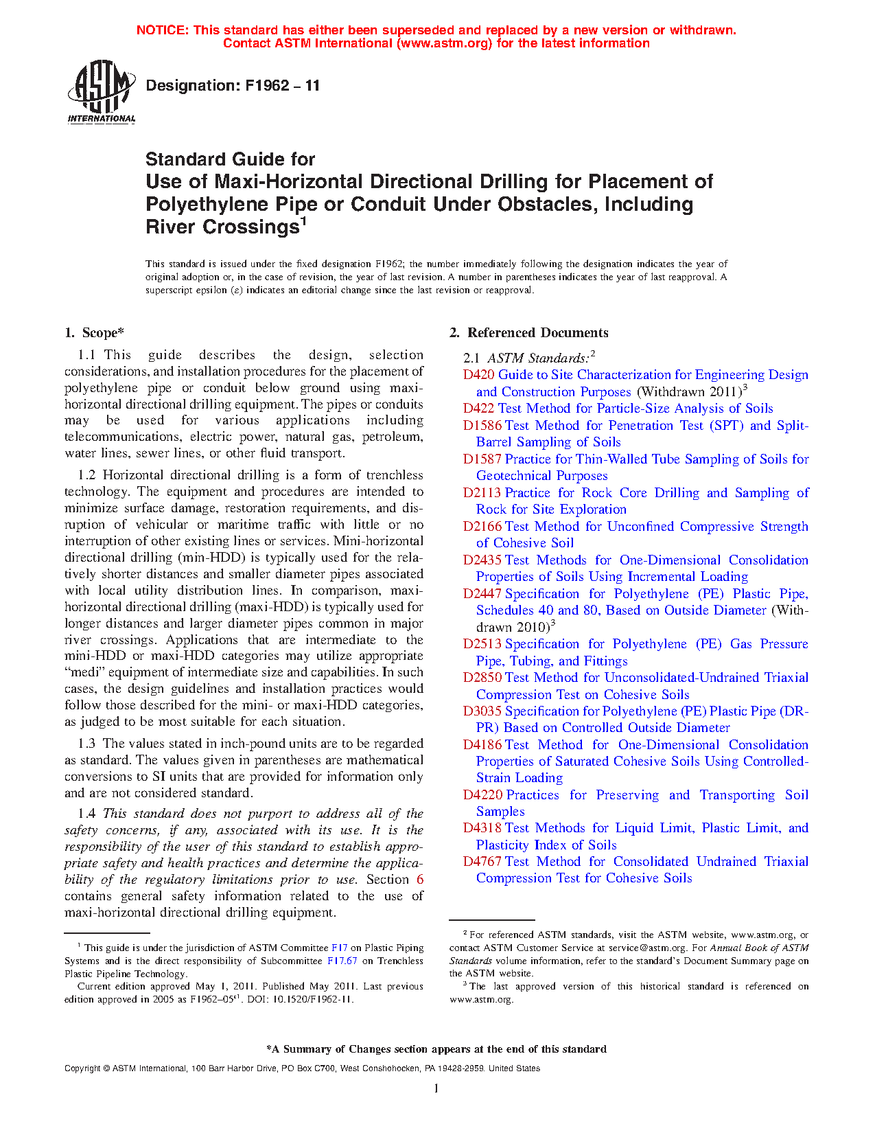 1.1 This guide describes the design, selection considerations, and installation procedures for the placement of polyethylene pipe or conduit below ground using maxi-horizontal directional drilling equipment. The pipes or conduits may be used for various applications including telecommunications, electric power, natural gas, petroleum, water lines, sewer lines, or other fluid transport.