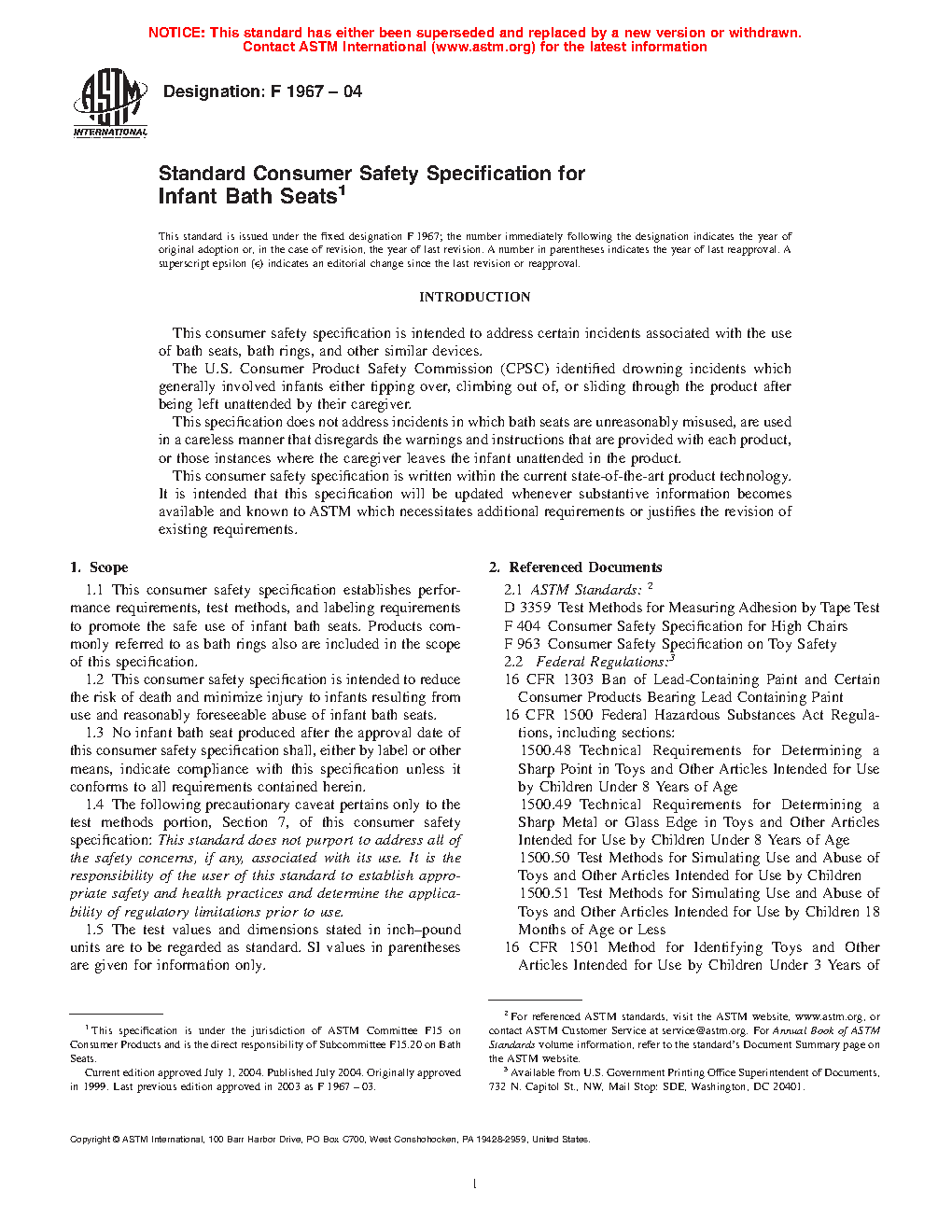 1.1 This consumer safety specification establishes performance requirements, test methods, and labeling requirements to promote the safe use of infant bath seats. Products commonly referred to as bath rings also are included in the scope of this specification. Traditional infant bath tubs that are used to bathe an infant are not within the scope of this standard.
