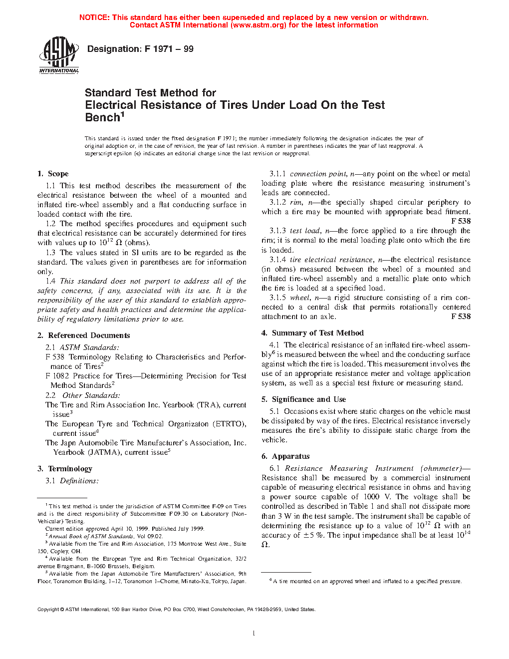 1.2 The method specifies procedures and equipment such that electrical resistance can be accurately determined for tires with values up to 1012 Ω (ohms).