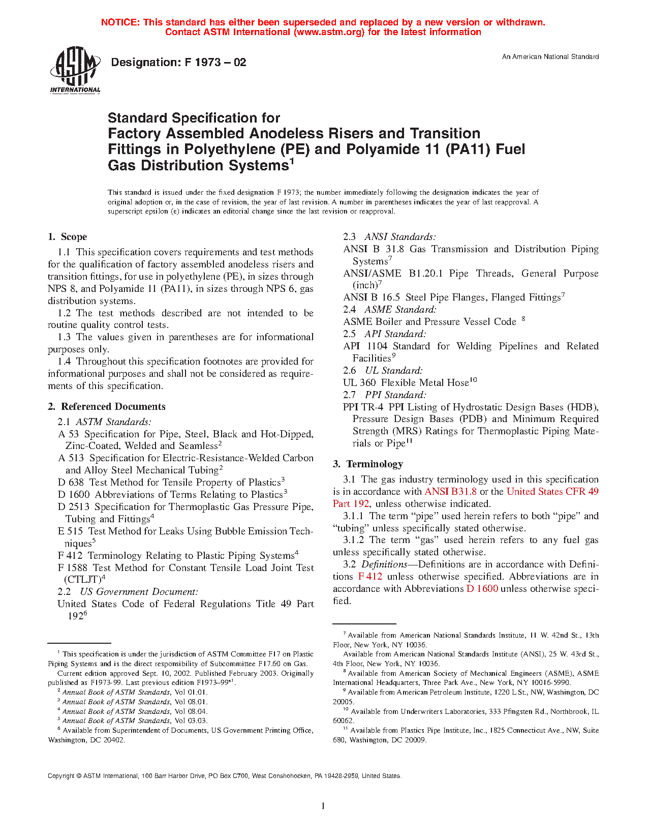 1.1 This specification covers requirements and test methods for the qualification of factory assembled anodeless risers and transition fittings, in sizes through NPS 8, for use in polyethylene (PE) gas distribution systems.