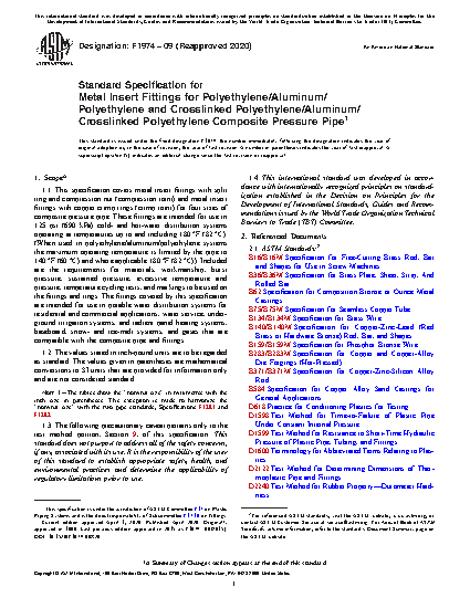 1.1 This specification covers metal insert fittings with split ring and compression nut (compression joint) and metal insert fittings with copper crimp rings (crimp joint) for four sizes of composite pressure pipe. These fittings are intended for use in 125 psi (690 kPa) cold- and hot-water distribution systems operating at temperatures up to and including 180 °F (82 °C). (When used in polyethylene/aluminum/polyethylene systems the maximum operating temperature is limited by the pipe to 140 °F (60 °C) and where applicable 180 °F (82 °C)). Included are the requirements for materials, workmanship, burst pressure, sustained pressure, excessive temperature and pressure, temperature cycling tests, and markings to be used on the fittings and rings. The fittings covered by this specification are intended for use in potable water distribution systems for residential and commercial applications, water service, underground irrigation systems, and radient panel heating systems, baseboard, snow- and ice-melt systems, and gases that are compatible with the composite pipe and fittings.