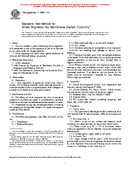 1.1 This test method is used to determine the susceptibility of a membrane switch to the migration of the silver between circuit traces under dc voltage potential.
