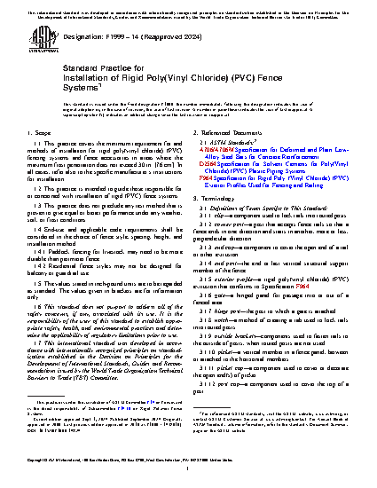 1.1 This practice covers the minimum requirement for and methods of installation for rigid poly(vinyl chloride) (PVC) fencing systems and fence accessories in areas where the maximum frost penetration does not exceed 30 in. (76 cm). In all cases, refer also to the specific manufacturer's instructions for installation.