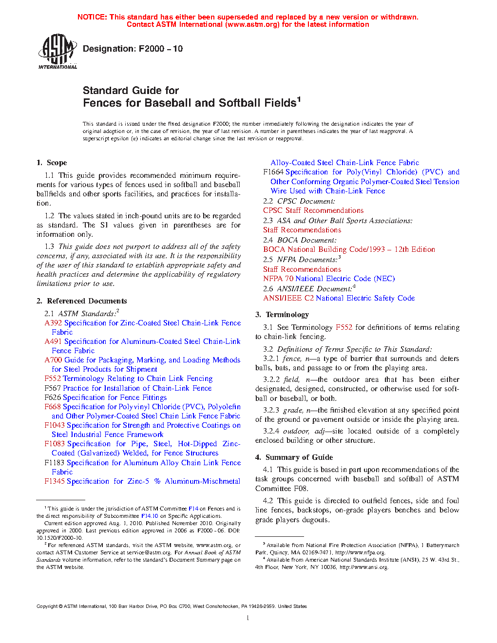 1.1 This specification provides recommended minimum requirements for various types of fences used in softball and baseball ballfields and other sports facilities, and practices for installation.