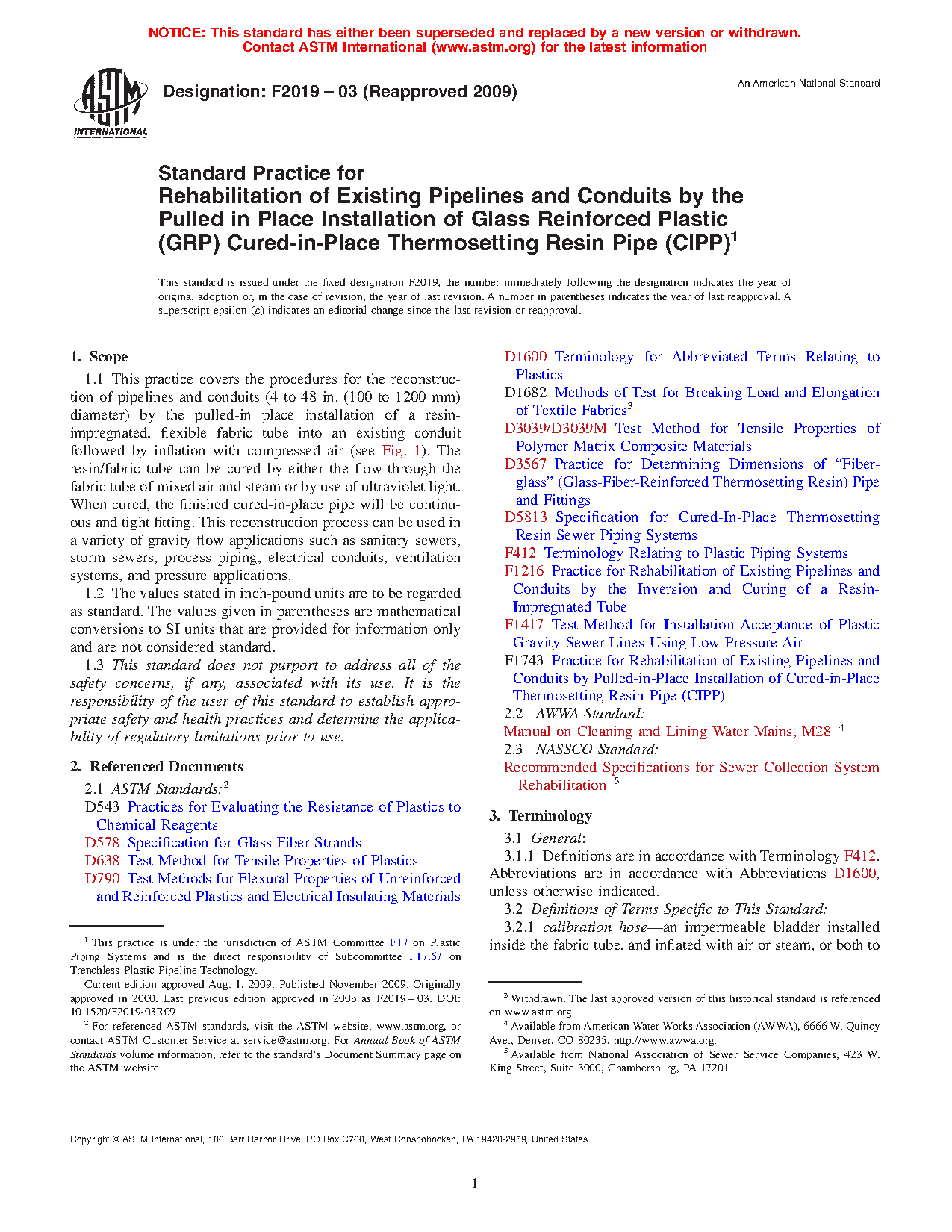 1.1 This practice covers the procedures for the reconstruction of pipelines and conduits (4 to 72 in. (100 to 1830 mm) diameter) by the pulled-in place installation of a resin-impregnated, glass fiber tube into an existing pipe or conduit followed by its inflation with compressed air pressure (see Fig. 1) to expand it firmly against the wall surface of the host structure. The photo-initiated resin system in the tube is then cured by exposure to ultraviolet (UV) light. When cured, the finished cured-in-place pipe will be a continuous and tight fitting pipe within a pipe. This type of reconstruction process can be used in a variety of gravity flow applications such as sanitary sewers, storm sewers, process piping, electrical conduits, and ventilation systems.