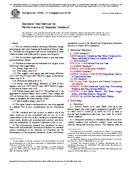 1.1 This test method evaluates the energy efficiency, energy consumption and water heating performance of booster heaters. The food service operator can use this evaluation to select a booster heater and understand its energy consumption.