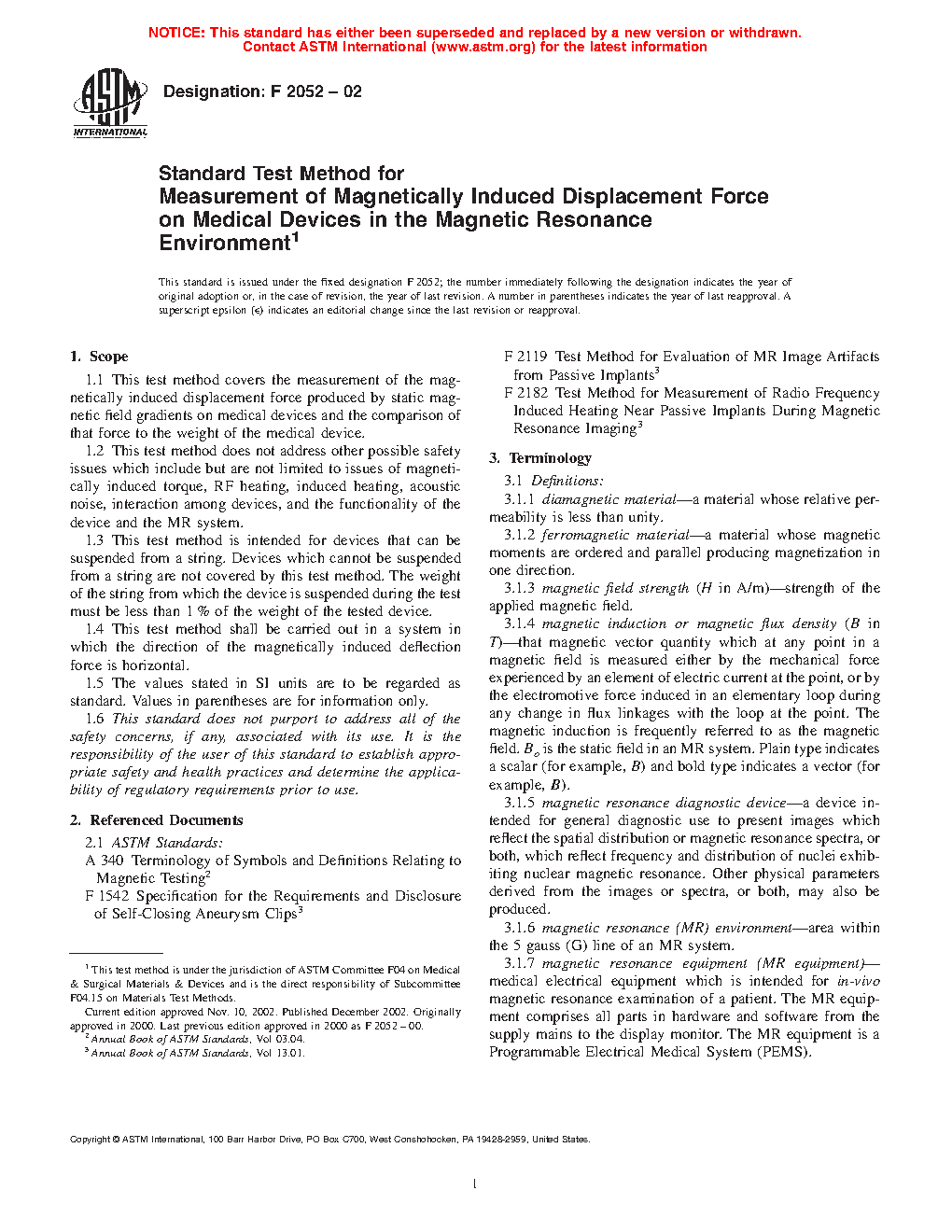 5.2 If the maximum magnetically induced displacement force for the specified magnetic field conditions (see Appendix X3) is less than the force on the device due to gravity (its weight), it is assumed that any risk imposed by the application of the magnetically induced force is no greater than any risk imposed by normal daily activity in the Earth’s gravitational field. This statement does not constitute an acceptance criterion; it is provided as a conservative reference point. It is possible that a greater magnetically induced displacement force can be acceptable and would not harm a patient or other individual in a specific case.