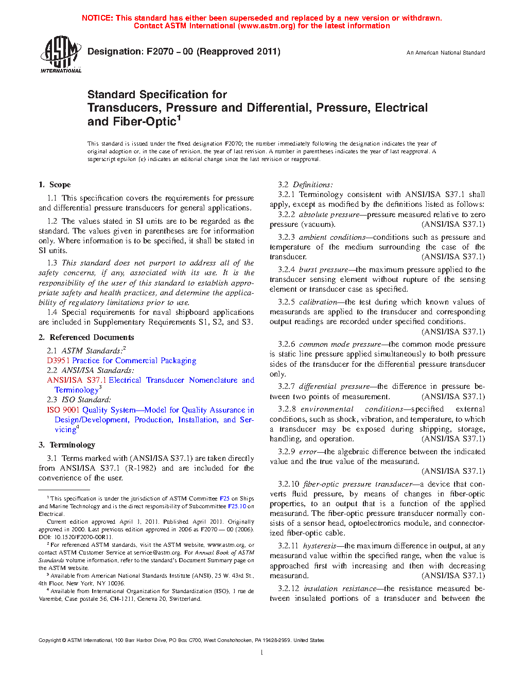 This specification covers the requirements for pressure and differential pressure transducers for general applications. Pressure transducers typically consist of a sensing element that is in contact with the process medium and a transduction element that modifies the signal from the sensing element to produce an electrical or optical output. Some parts of the transducer may be hermetically sealed if those parts are sensitive to and may be exposed to moisture. Pressure connections must be threaded with appropriate fittings to connect the transducer to standard pipe fittings or to other appropriate leak-proof fittings. The output cable must be securely fastened to the body of the transducer. Most common sensing elements are diaphragms, bellows, capsules, Bourdon tubes, and piezoelectric crystals. The function of the sensing element is to produce a measurable response to applied pressure or vacuum. The response may be sensed directly on the element or a separate sensor may be used to detect element response. The following are the different types of electrical pressure transducers: differential transformed transducer, potentiometric transducer, strain gage transducer, variable reluctance transducer, and piezoelectric transducer. Different kinds of fiber-optic pressure transducers shall be discussed: Fabry-Perot interferometer, Bragg grating interferometer, quartz resonator, and micromachined membrane/diaphragm deflection. The following physical properties of transducers shall be determined: enclosure, transducer mounting, external configuration, standard electrical connection, pressure connections, damping, size, and weight. Different tests shall be conducted in order to determine the service life and overall performance of the transducers.