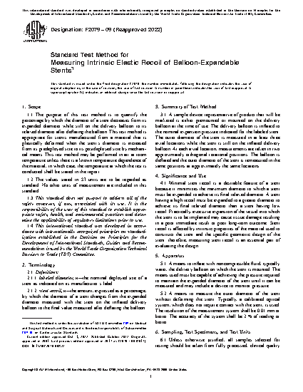 1.1 The purpose of this test method is to quantify the percentage by which the diameter of a stent decreases from its expanded diameter while still on the delivery balloon to its relaxed diameter after deflating the balloon. This test method is appropriate for stents manufactured from a material that is plastically deformed when the stent's diameter is increased from its predeployed size to its postdeployed size by mechanical means. This test method may be performed in air at room temperature unless there is a known temperature dependence of the material, in which case, the temperature at which the test is conducted shall be stated in the report.