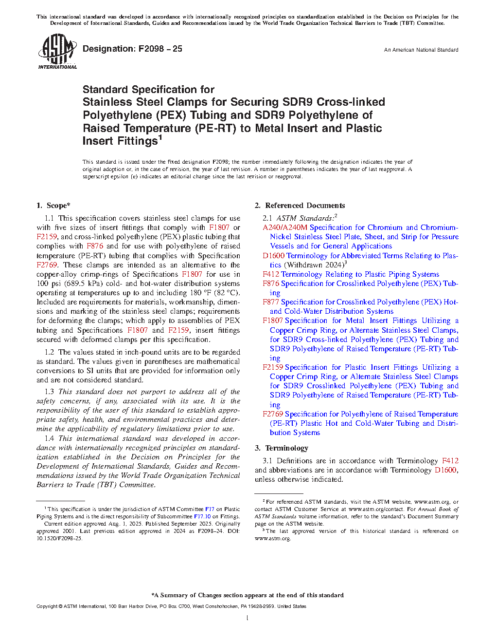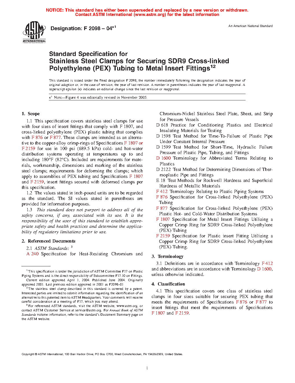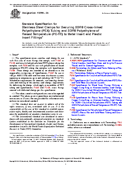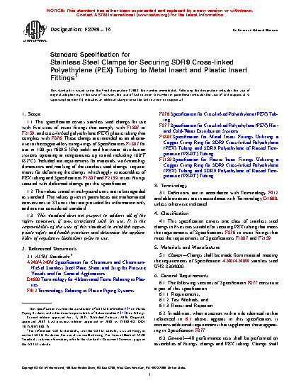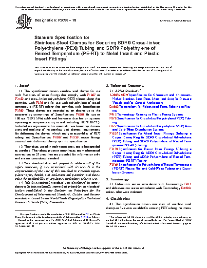 1.1 This specification covers stainless steel clamps for use with five sizes of insert fittings that comply with F1807 or F2159, and cross-linked polyethylene (PEX) plastic tubing that complies with F876 and for use with polyethylene of raised temperature (PE-RT) tubing that complies with Specification F2769. These clamps are intended as an alternative to the copper-alloy crimp-rings of Specifications F1807 for use in 100 psi (689.5 kPa) cold- and hot-water distribution systems operating at temperatures up to and including 180°F (82°C). Included are requirements for materials, workmanship, dimensions and marking of the stainless steel clamps; requirements for deforming the clamps; which apply to assemblies of PEX tubing and Specifications F1807 and F2159, insert fittings secured with deformed clamps per this specification.