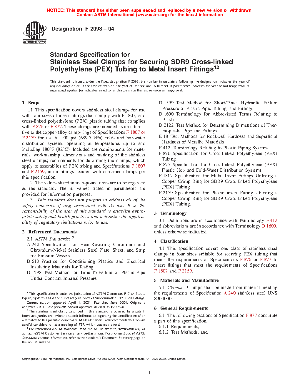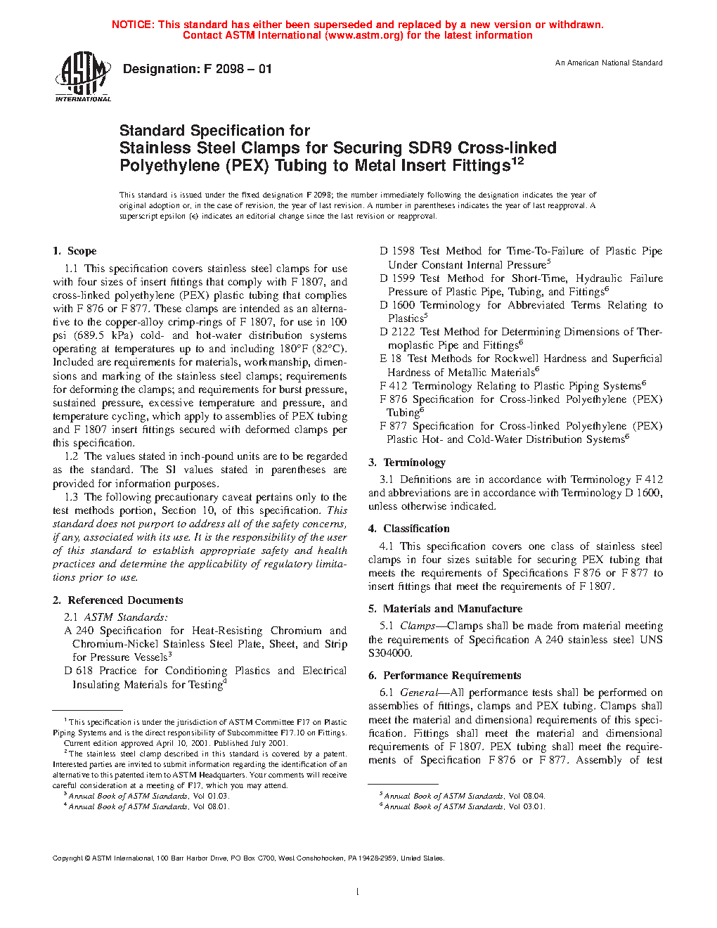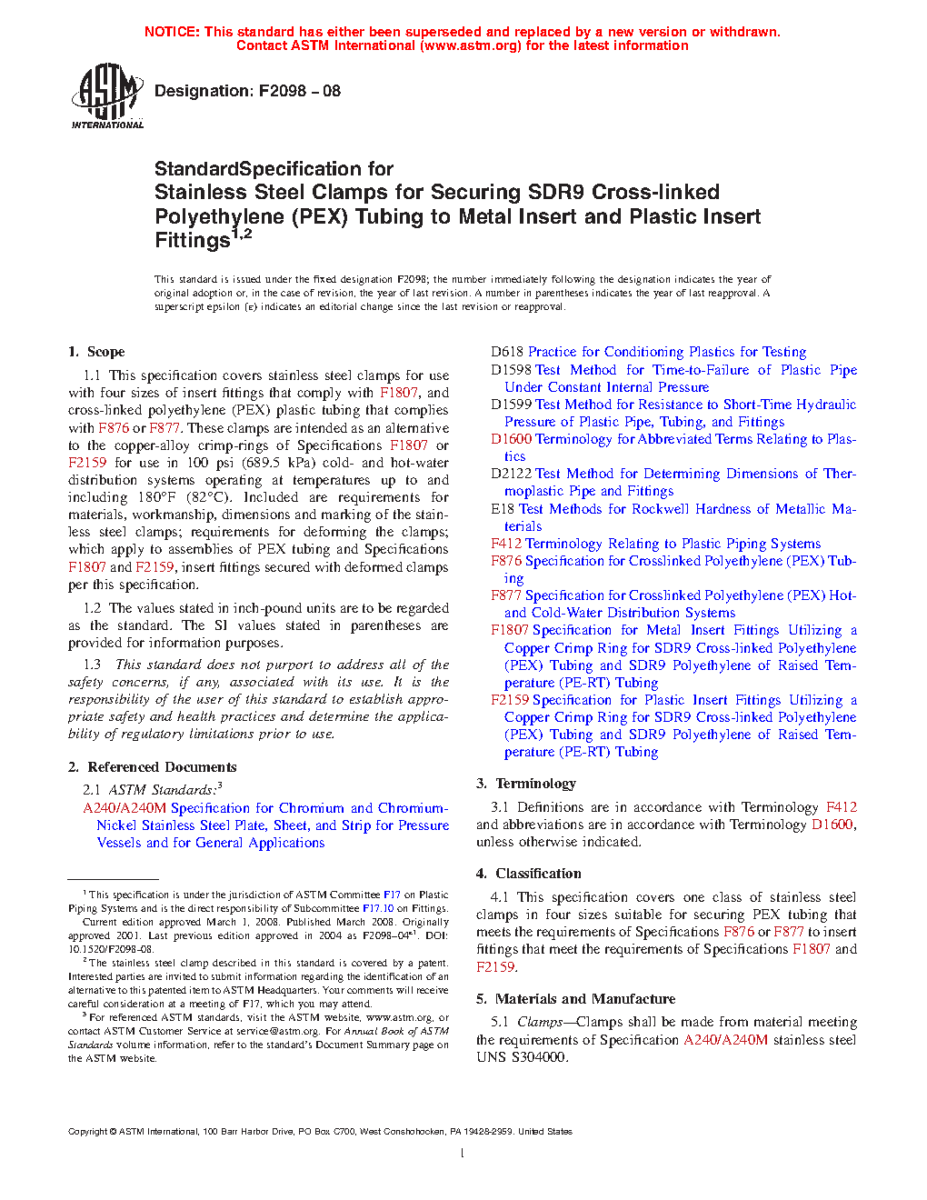 1.1 This specification covers stainless steel clamps for use with five sizes of insert fittings that comply with F1807 or F2159, and cross-linked polyethylene (PEX) plastic tubing that complies with F876 and for use with polyethylene of raised temperature (PE-RT) tubing that complies with Specification F2769. These clamps are intended as an alternative to the copper-alloy crimp-rings of Specifications F1807 for use in 100 psi (689.5 kPa) cold- and hot-water distribution systems operating at temperatures up to and including 180°F (82°C). Included are requirements for materials, workmanship, dimensions and marking of the stainless steel clamps; requirements for deforming the clamps; which apply to assemblies of PEX tubing and Specifications F1807 and F2159, insert fittings secured with deformed clamps per this specification.