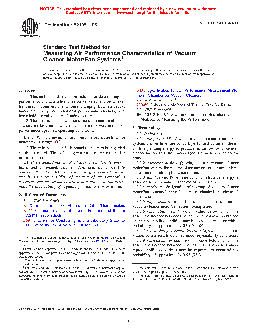 1.2 These tests and calculations include determination of suction, airflow, air power, maximum air power, and input power under specified operating conditions.