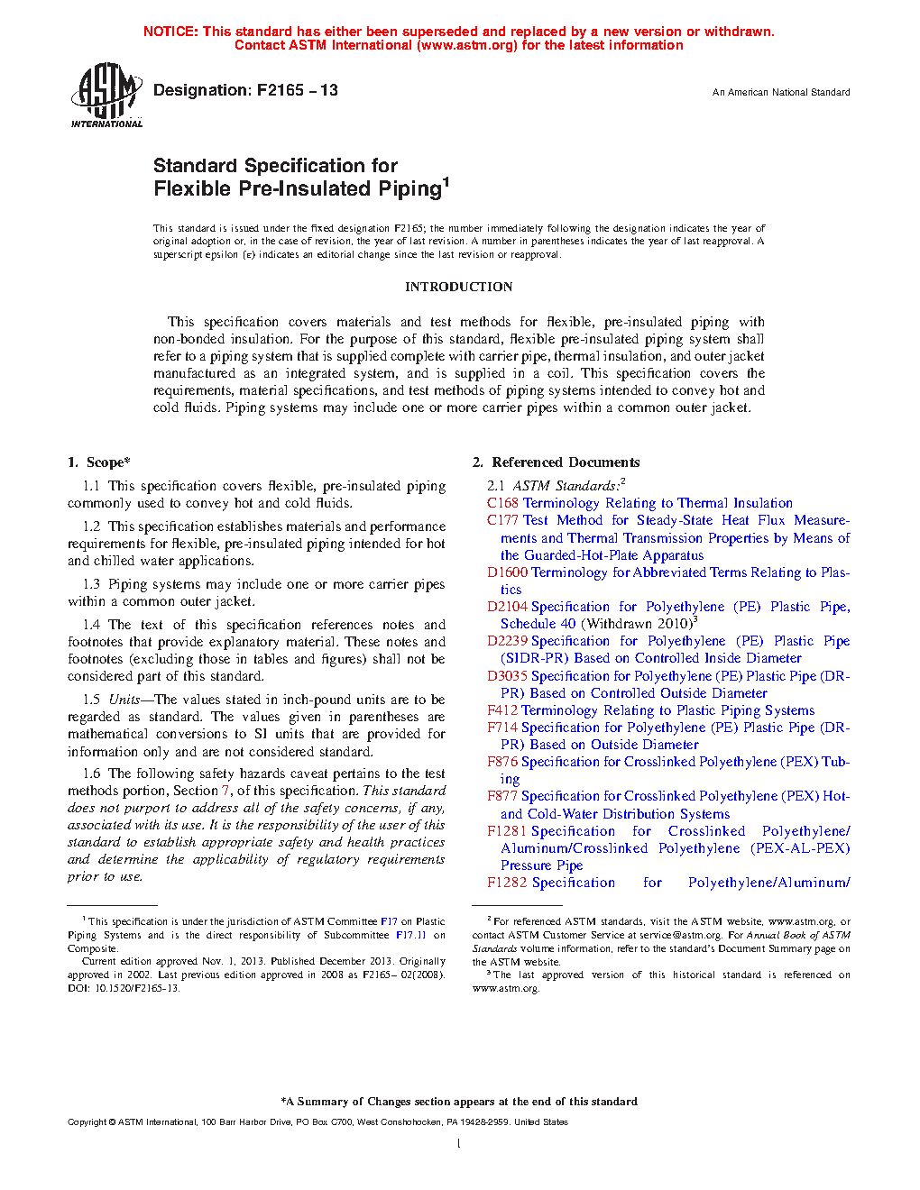 1.1 This specification covers flexible, pre-insulated plastic piping systems commonly used to convey hot and cold fluids, including piping systems that are supplied complete with plastic carrier pipe, thermal insulation, and outer jacket manufactured as an integrated system, and are supplied in a coil or as a straight length. Both bonded and non-bonded insulation types are included. Included are requirements and test methods for material, workmanship, dimensions, and endseal testing. Requirements for markings are also given. The components covered by this specification are intended for use in, but not limited to, residential and commercial, hot- and cold-potable water distribution systems, reclaimed water, fire protection, municipal water service lines, radiant heating and cooling systems, hydronic distribution systems, snow and ice melting systems, geothermal ground loops, district heating, turf conditioning, compressed air distribution and building services pipe, provided that the carrier pipe or tubing covered herein complies with applicable code requirements.