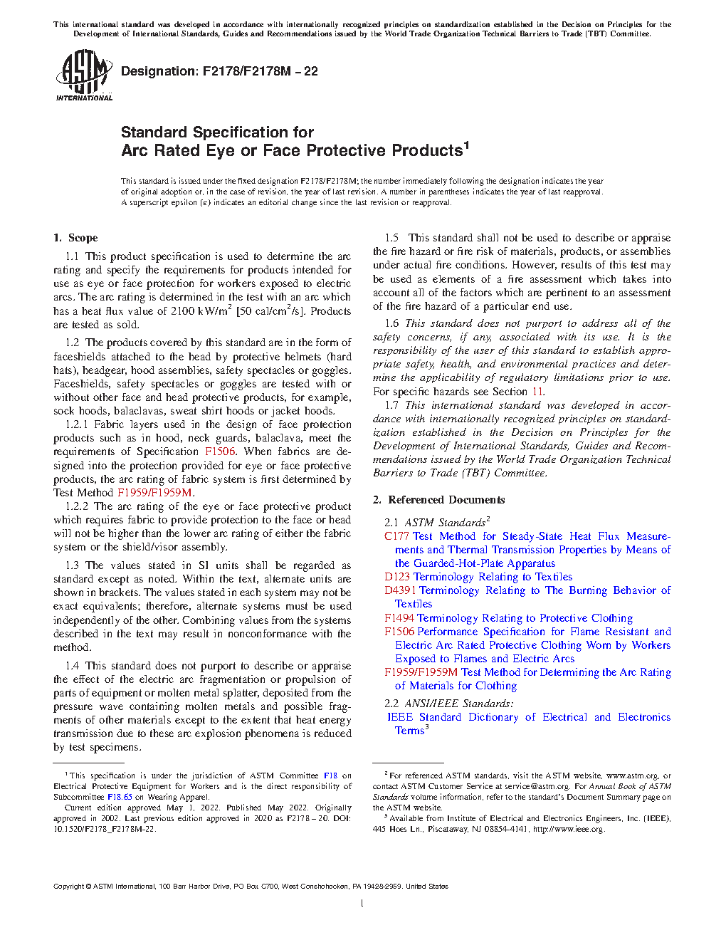 1.2.1 Fabric layers used in the design of face protection products such as in hood, neck guards, balaclava, meet the requirements of Specification F1506. When fabrics are designed into the protection provided for eye or face protective products, the arc rating of fabric system is first determined by Test Method F1959/F1959M.