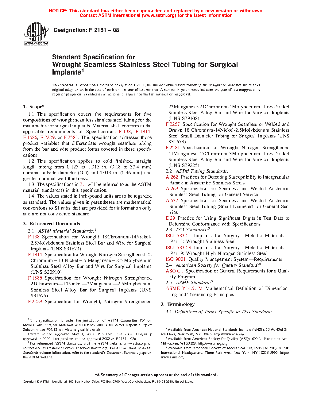 1.1 This specification covers the requirements for three compositions of wrought seamless stainless steel tubing for the manufacture of surgical implants. Material shall conform to the applicable requirements of Specifications F 138, F 1314, or F 1586. This specification addresses those product variables that differentiate wrought seamless tubing from the bar and wire product forms covered in these specifications.