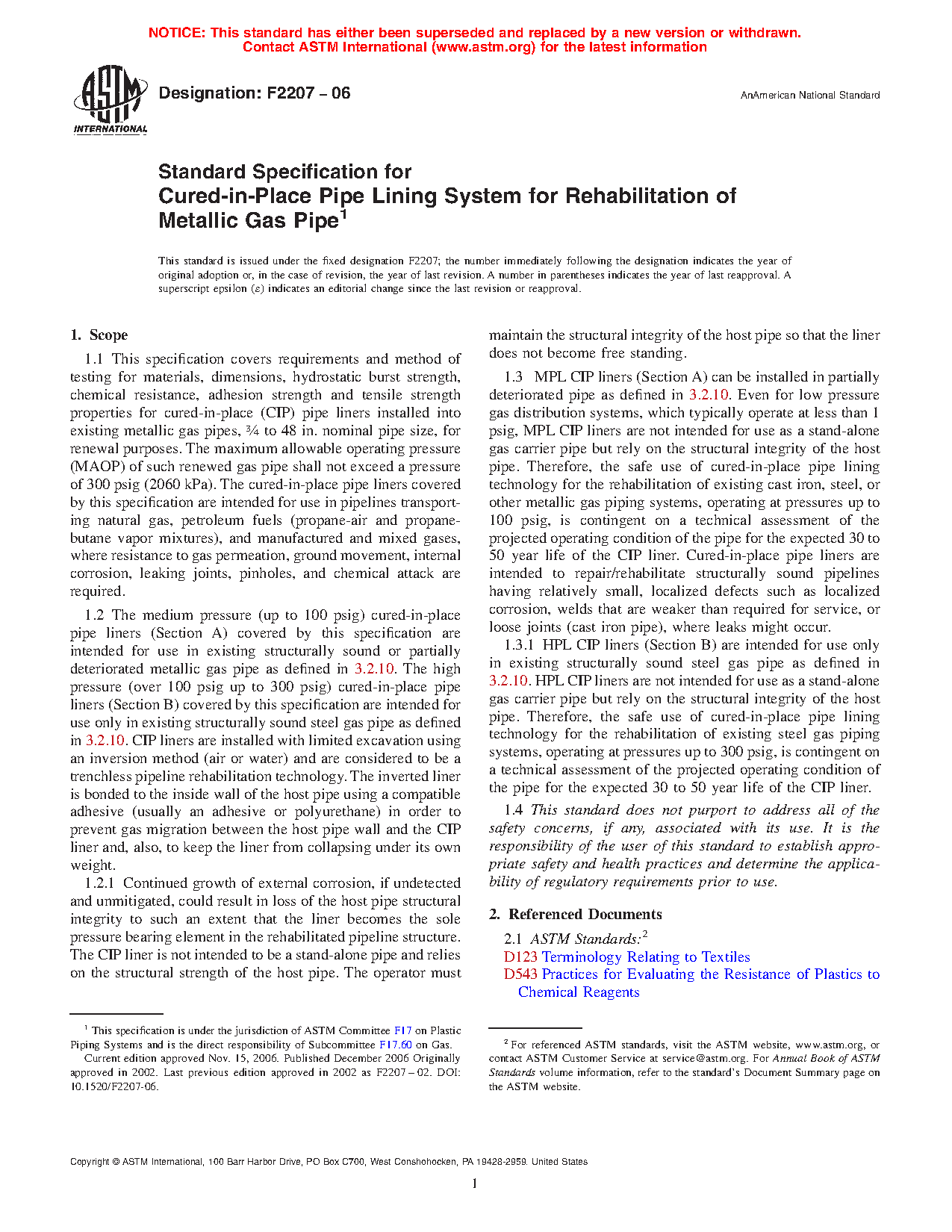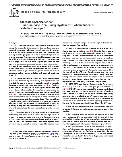 This specification covers the requirements and test procedures for materials, dimensions, hydrostatic burst strength, chemical resistance, peeling strength, adhesion strength, and tensile strength properties for cured-in-place (CIP) pipe liners installed into existing metallic gas pipes for rehabilitation purposes. These cured-in-place pipe liners are intended for use in pipelines that transport natural gas, petroleum fuels (propane-air and propanebutane vapor mixtures), and manufactured and mixed gases, where resistance to gas permeation, ground movement, internal corrosion, leaking joints, pinholes, and chemical attack are required. The materials, which shall be considered separately for testing, consist of the flexible tubing, jacket, elastomer skin, and adhesive system.