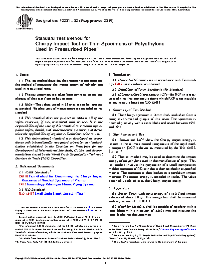 1.1 This test method describes the specimen preparation and the method of measuring the impact energy of polyethylene used in pressurized pipes.