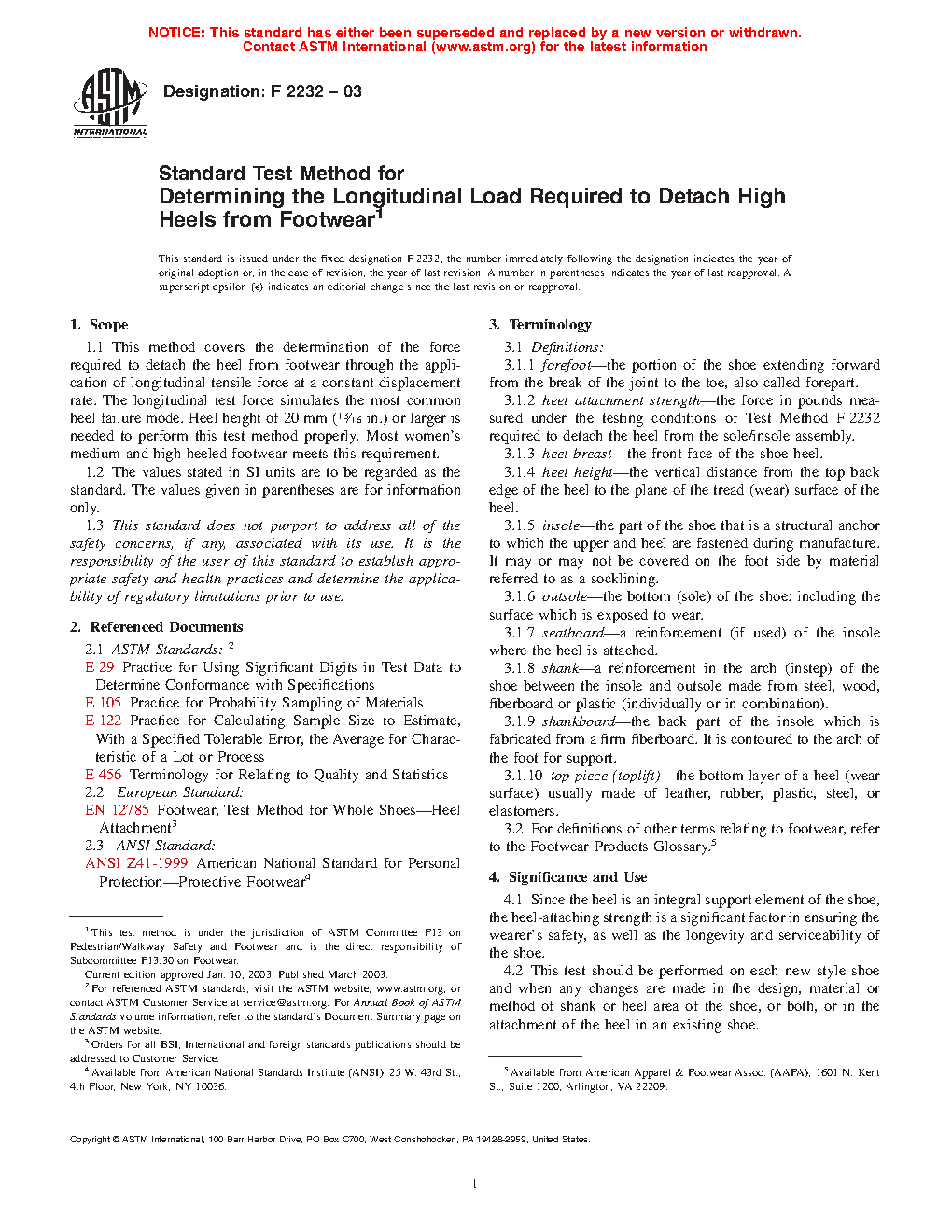 1.1 This test method covers the determination of the force required to detach the heel from footwear through the application of longitudinal tensile force at a constant displacement rate. The longitudinal test force simulates the most common heel failure mode. Heel height of 20 mm (13/16 in.) or larger is needed to perform this test method properly. Most women's medium and high heeled footwear meets this requirement.