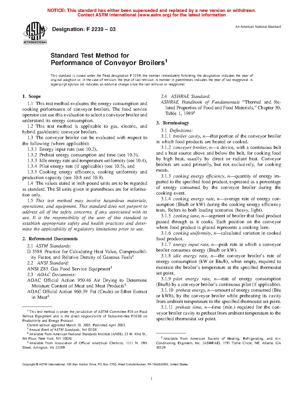 1.1 This test method evaluates the energy consumption and cooking performance of conveyor broilers. The food service operator can use this evaluation to select a conveyor broiler and understand its energy consumption.