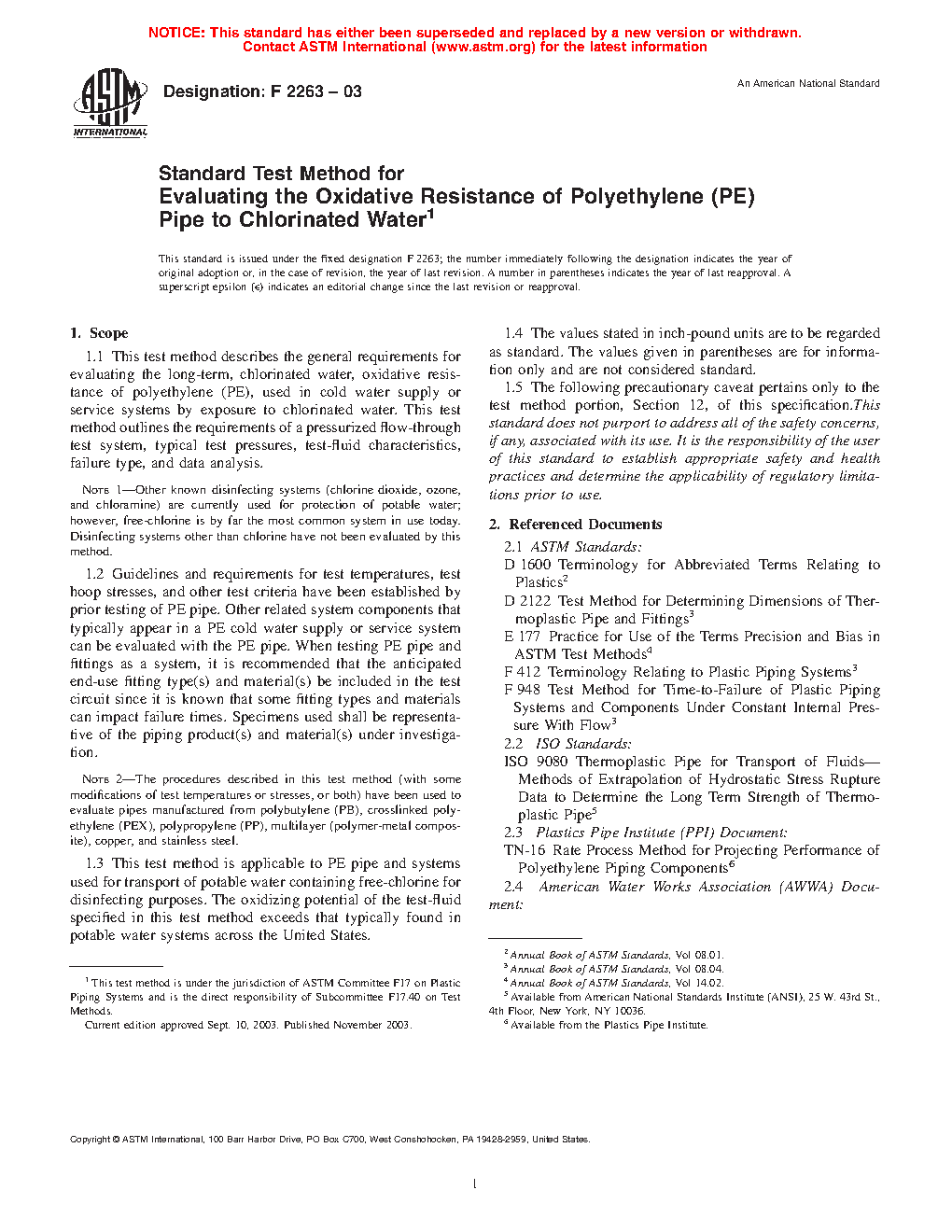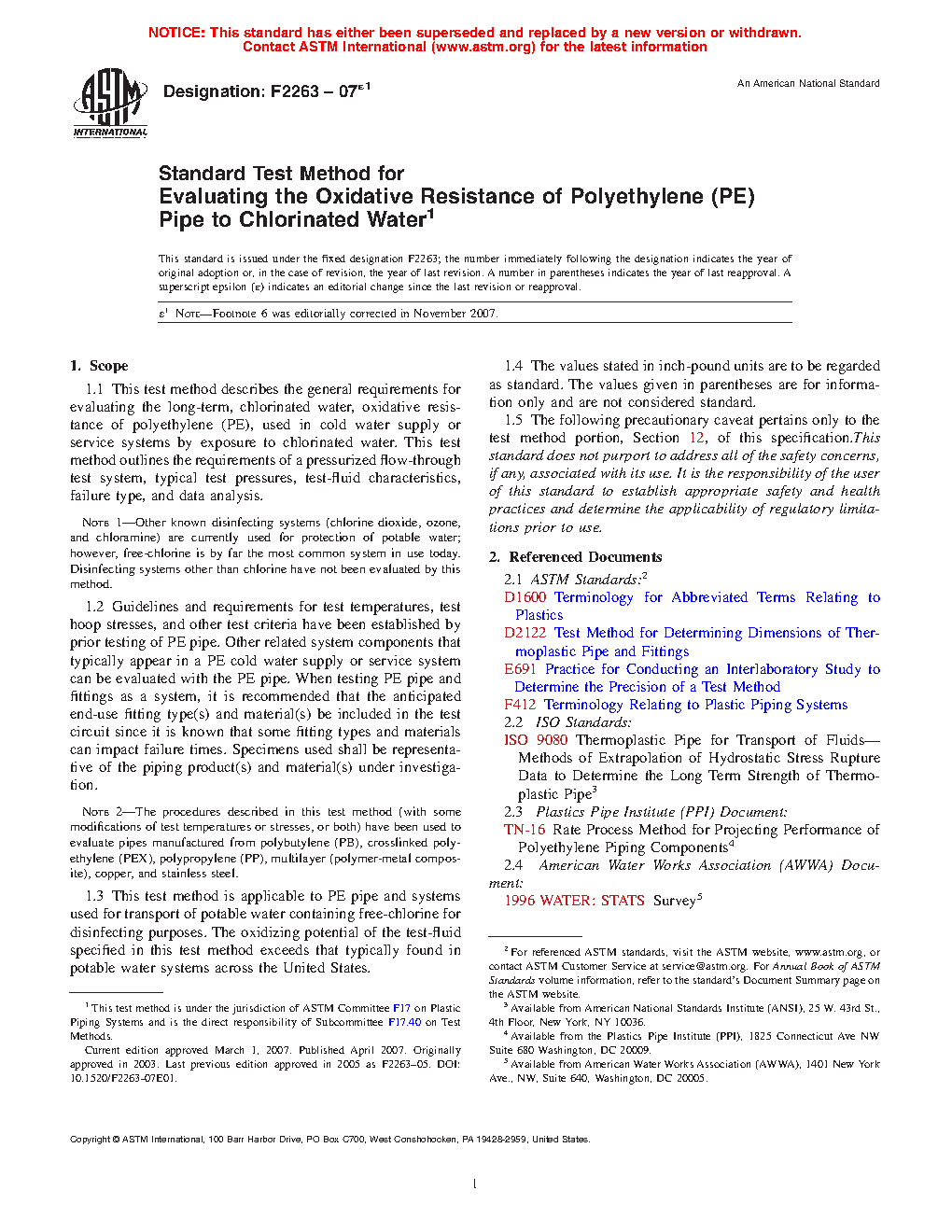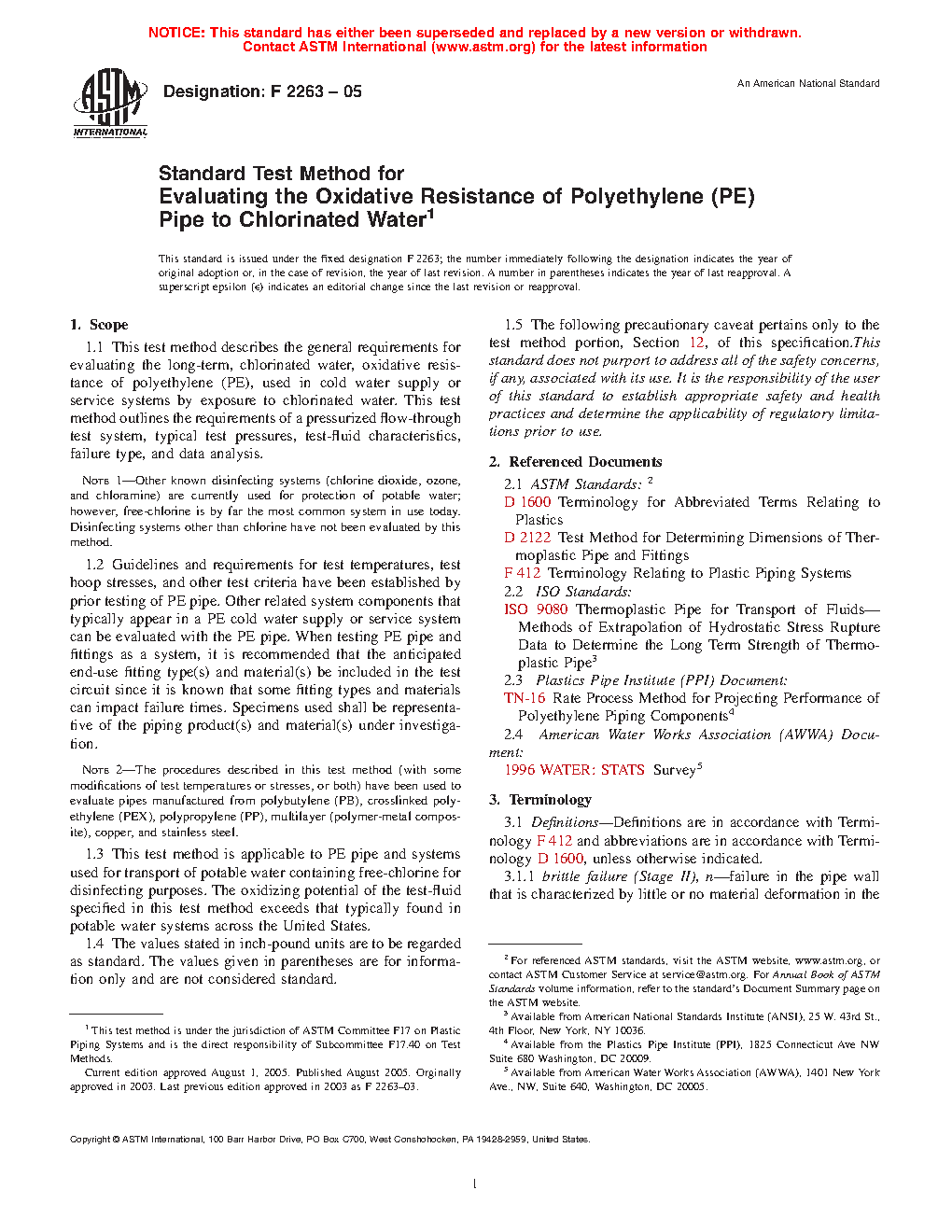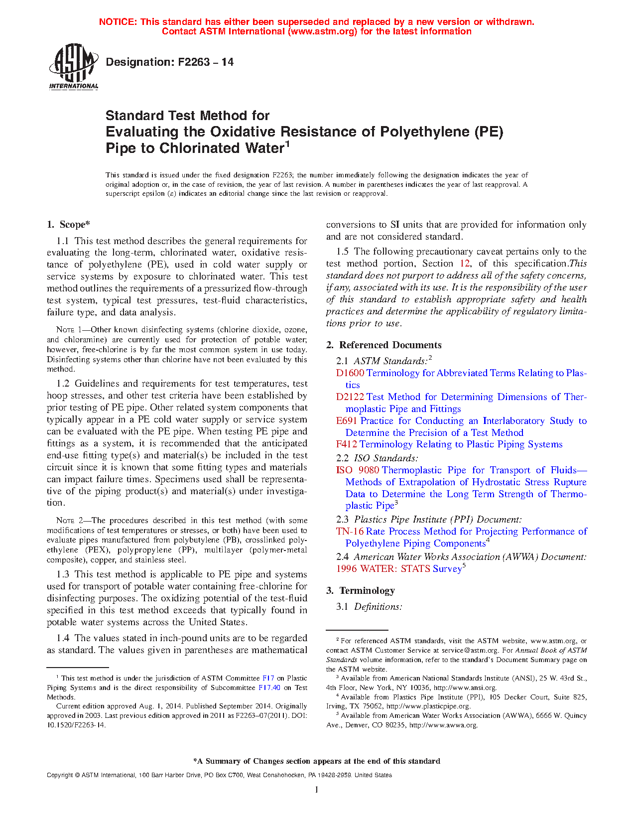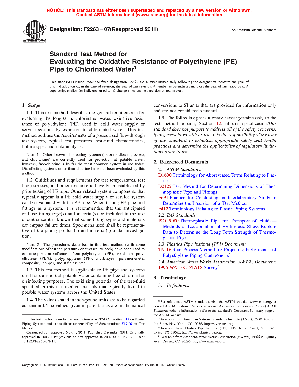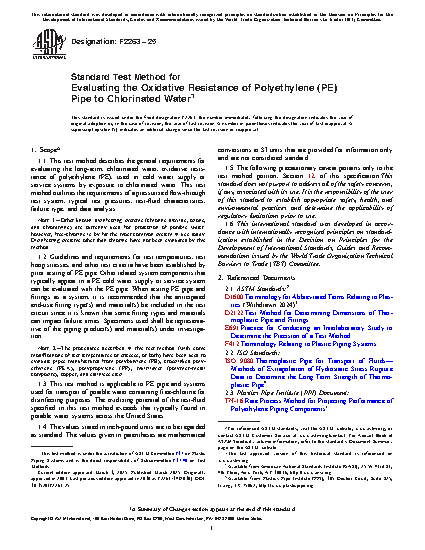 1.3 This test method is applicable to PE pipe and systems used for transport of potable water containing free-chlorine for disinfecting purposes. The oxidizing potential of the test-fluid specified in this test method exceeds that typically found in potable water systems across the United States.