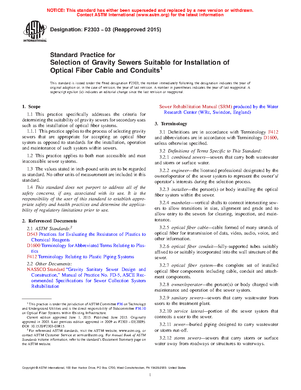1.1.1 This practice applies to the process of selecting gravity sewers that are appropriate for accepting an optical fiber system as opposed to standards for the installation, operation and maintenance of such system within sewers.