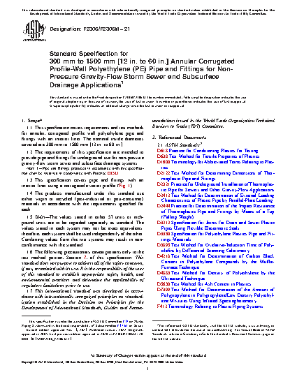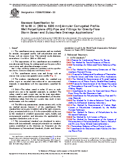 1.1 This specification covers requirements and test methods for annular, corrugated profile wall polyethylene pipe and fittings with an interior liner. The nominal inside diameters covered are 300 mm to 1500 mm [12 in. to 60 in.].