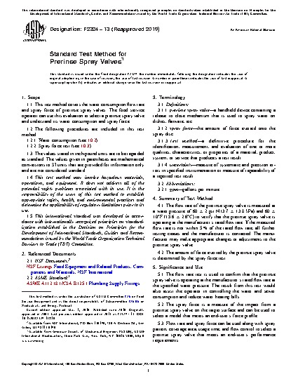 1.1 This test method covers the water consumption flow rate and cleanability of prerinse spray valves (here after referred to as spray valves). The food service operator can use this evaluation to select a spray valve and understand its water consumption and cleaning effectiveness.