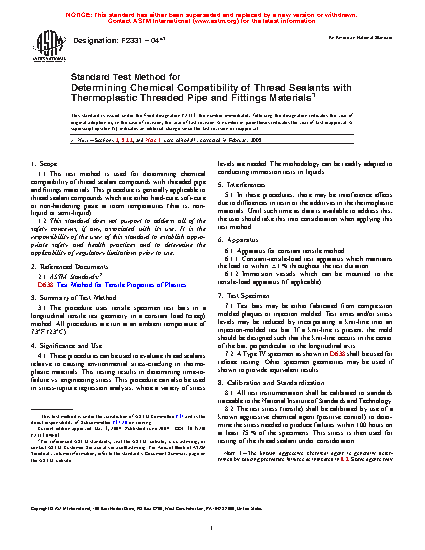4.1 These procedures can be used to evaluate chemicals or materials expected to come in contact with plastic piping relative to causing environmental stress-cracking in thermoplastic materials. This testing results in determining time-to-failure versus engineering stress. This procedure can also be used in stress-rupture regression analysis, where a variety of stress levels are needed. The methodology can be readily adapted to conducting immersion tests in liquids or testing temperatures other than 73 °F (23 °C).