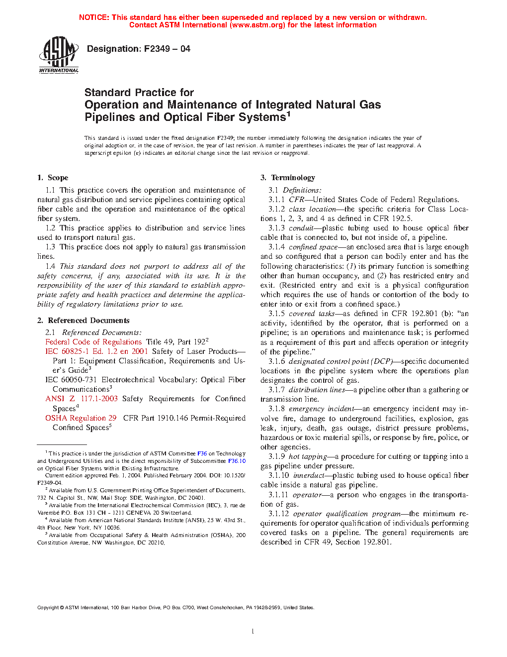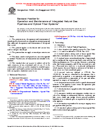 1.1 This practice covers the operation and maintenance of natural gas distribution and service pipelines containing optical fiber cable and the operation and maintenance of the optical fiber system.