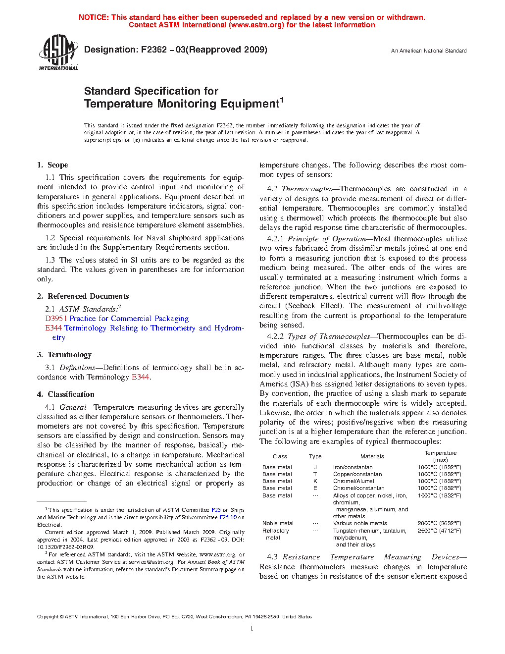This specification covers the requirements for temperature monitoring equipment for use in general applications. Such equipment shall be comprised of a temperature sensor in combination with a signal conditioner, a power supply, and a test device. Temperature sensors covered by this specification are divided into thermocouples, which measure direct or differential temperature, and resistance thermometers, which measure temperature changes based on changes in resistance of sensor element exposed to temperature. Each of these types of sensors may further be classified as follows. Thermocouples can be classified into three classes based on materials and temperature ranges: base metal, noble metal, and refractory metal. Resistance thermometers, on the other hand, can be classified according to the type of sensor element used: metal sensor element (resistance temperature detector or RTD) or semiconductor sensor element (thermistor). RTDs are available in various design configurations including averaging, annular, and combination RTD-thermocouple, while thermistors are classified based on the configuration of the semiconductor sensor element: bead, disc, washer, or rod. Qualification test shall be performed on the equipment and shall comply with the physical property and performance requirements specified.