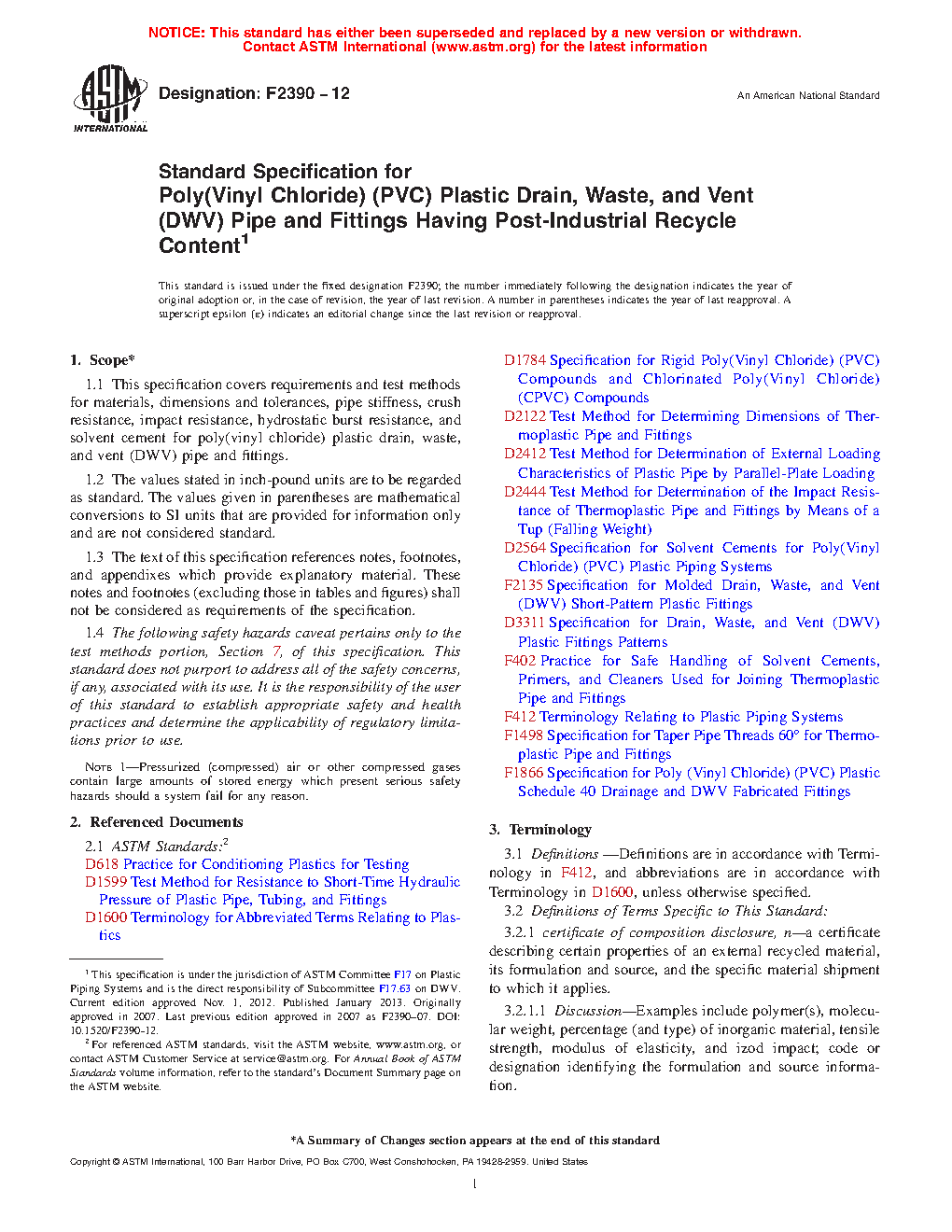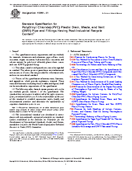 This specification covers the basic requirements and corresponding test methods for poly(vinyl chloride) (PVC) plastic drain, waste, and vent (DWV) pipes and fittings that contain a uniform blend of virgin PVC compound and post-industrial recycle material. When evaluated by the test procedures provided herein, the pipes and fittings shall conform to specified values of the following requirements: dimensions; pipe stiffness, deflection load, lower confidence limit, and flattening resistance; crush resistance; impact resistance; hydrostatic burst resistance; and solvent cement.