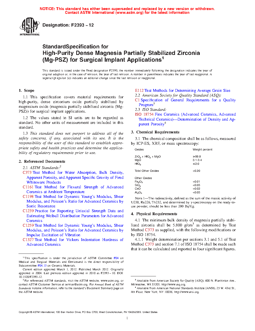 1.1 This specification covers material requirements for high-purity, dense zirconium oxide partially stabilized by magnesium oxide (magnesia partially stabilized zirconia (Mg-PSZ)) for surgical implant applications.