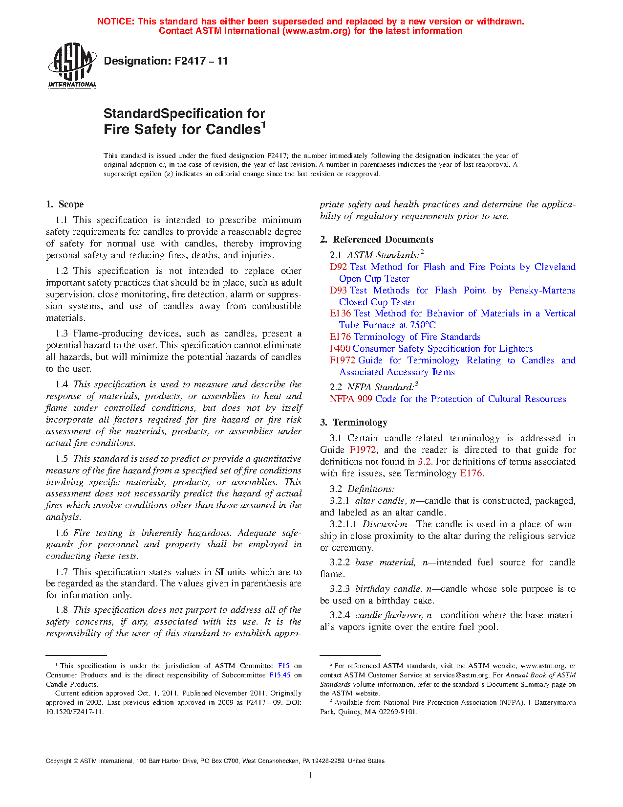 1.1 This specification is intended to prescribe minimum safety requirements for candles and candle ensembles to provide a reasonable degree of safety for normal use with candles, thereby improving personal safety and reducing fires, deaths, and injuries.