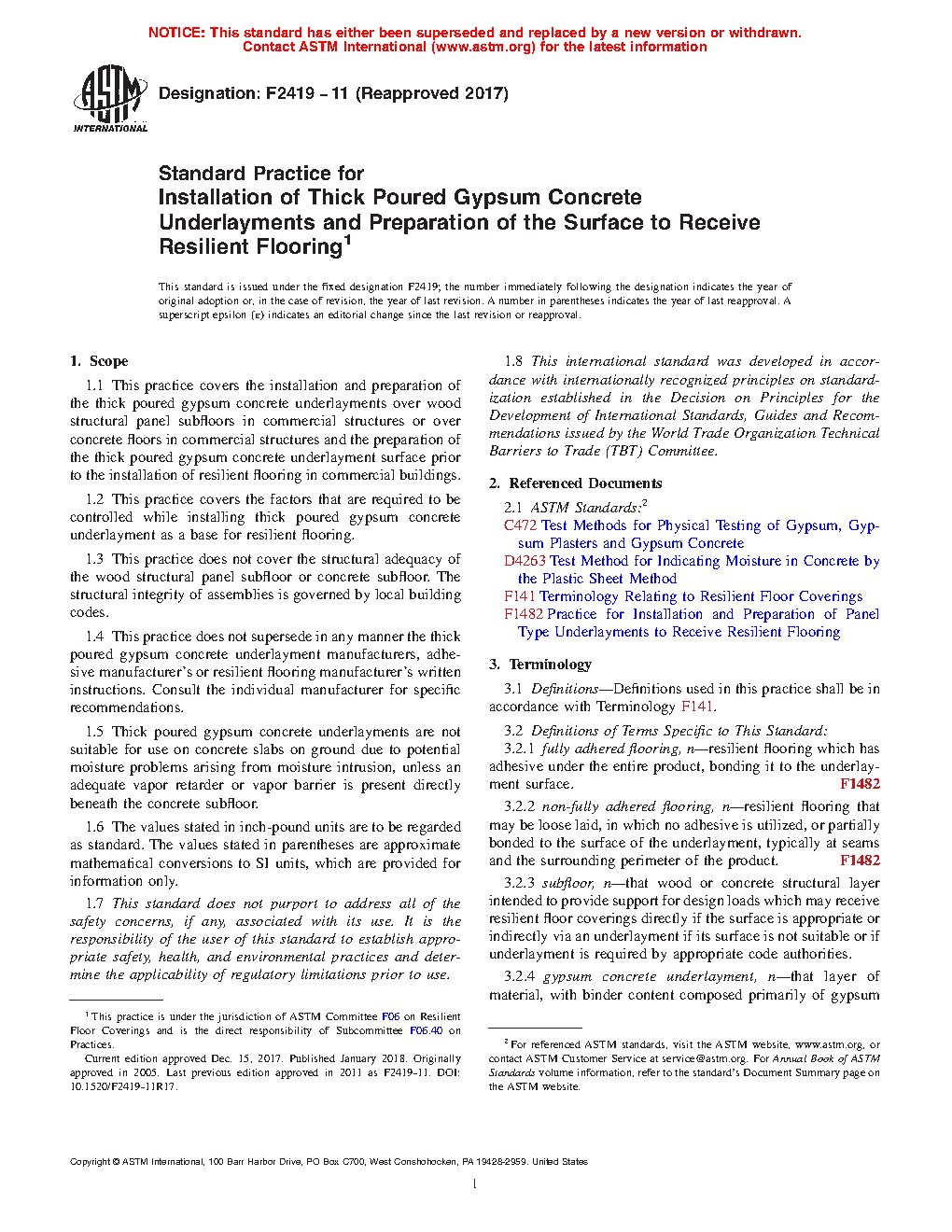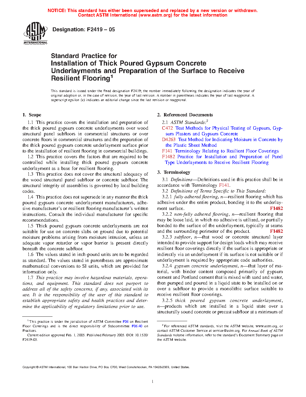 1.4 This practice does not supersede in any manner the thick poured gypsum concrete underlayment manufacturers, adhesive manufacturer’s or resilient flooring manufacturer’s written instructions. Consult the individual manufacturer for specific recommendations.