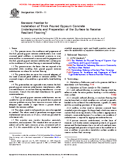 1.1 This practice covers the installation and preparation of the thick poured gypsum concrete underlayments over wood structural panel subfloors in commercial structures or over concrete floors in commercial structures and the preparation of the thick poured gypsum concrete underlayment surface prior to the installation of resilient flooring in commercial buildings.