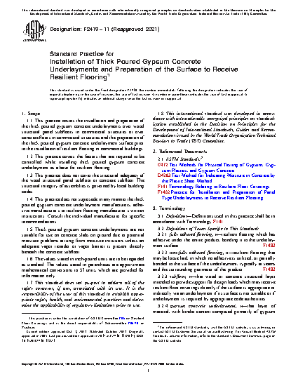 4.1 This practice provides minimum recommendations for the installation of thick poured gypsum concrete floor underlayments suitable to receive resilient floor coverings. This practice establishes the proper preparation, installation and quality control for thick poured gypsum concrete floor underlayments.