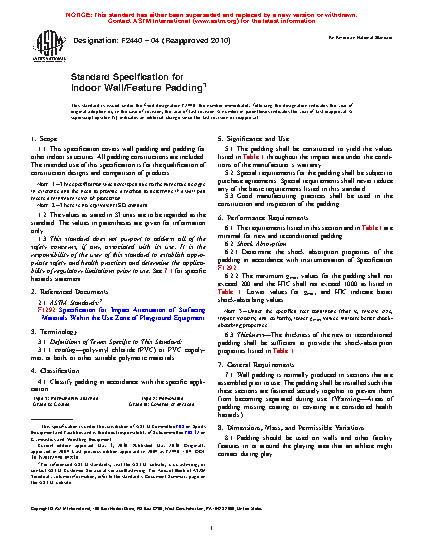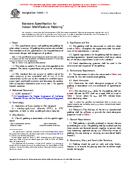 This specification covers wall padding and padding for other indoor structures. All padding constructions are included. Qualification of construction designs and comparison of products shall be discussed. The padding can be classified into two types: Type 1 for permanently attached paddings and Type 2 for removable paddings. The paddings can also be classified into grades: Grade A for coated paddings and Grade B for covered or encased paddings. Physical properties such as shock absorption, gmax, HIC, and thickness shall be determined.