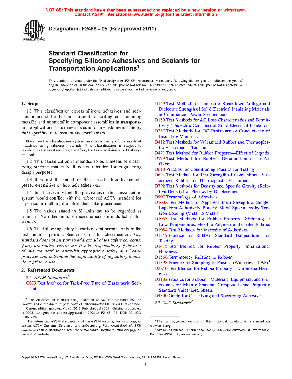 1.1 This classification covers silicone adhesives and sealants intended for but not limited to sealing and retaining metallic and nonmetallic component assemblies in transportation applications. The materials cure to an elastomeric state by their specified cure system and mechanism.