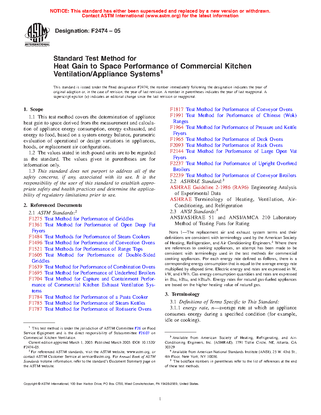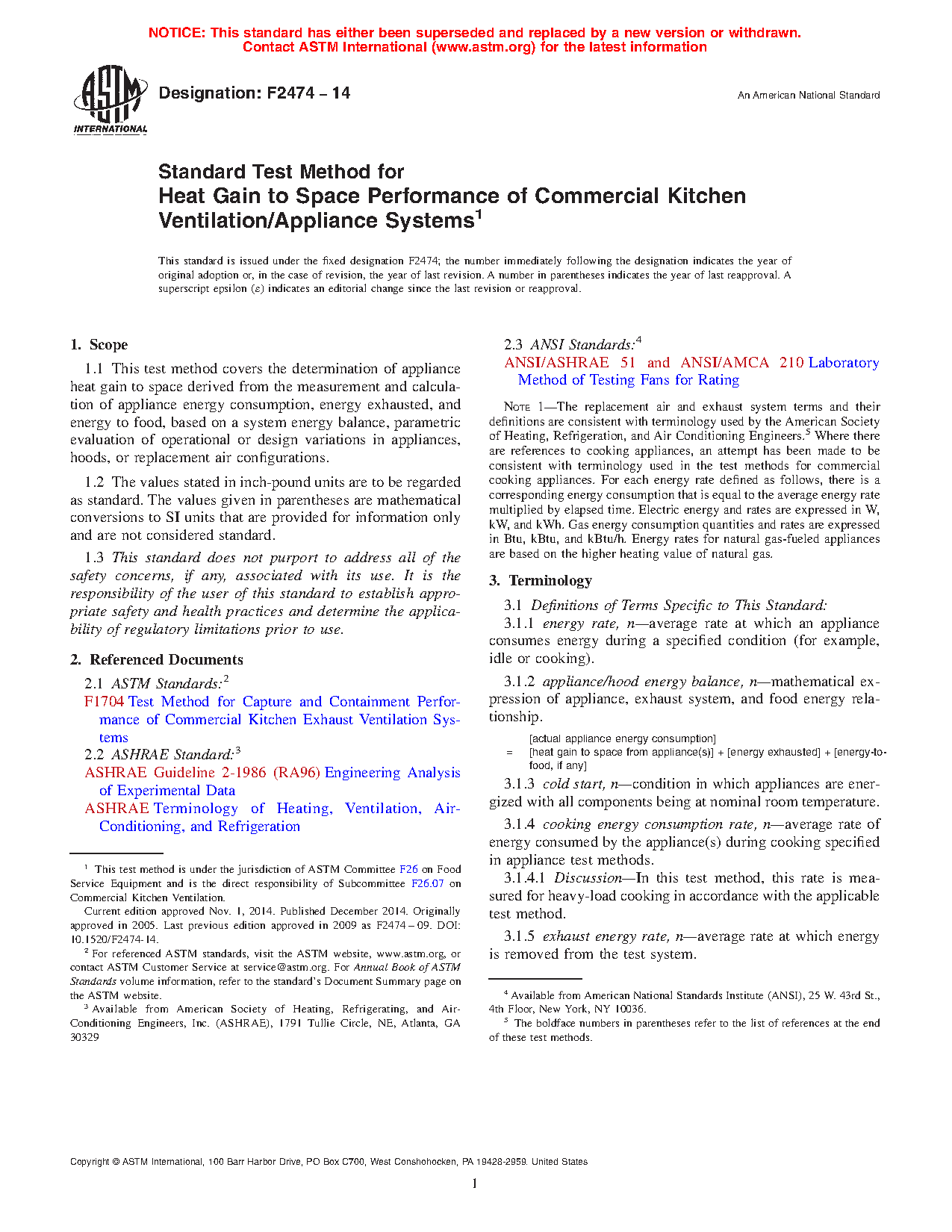 1.1 This test method covers the determination of appliance heat gain to space derived from the measurement and calculation of appliance energy consumption, energy exhausted, and energy to food, based on a system energy balance, parametric evaluation of operational or design variations in appliances, hoods, or replacement air configurations.